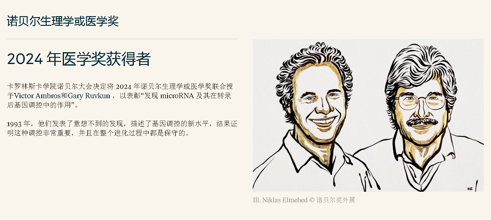 新华社快讯:瑞典卡罗琳医学院7日宣布,美国科学家维克托·安布罗斯和加里·鲁夫坎因发现微小核糖核酸及其在转录后基因调控中的作用而获得2024年诺贝尔生理学或医学奖。