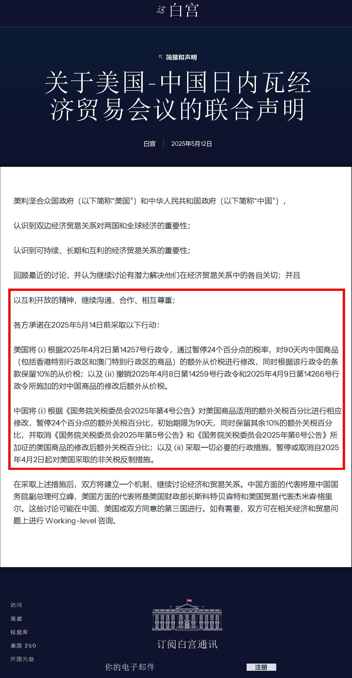 美国将(一)修改2025年4月2日第14257号行政令中规定的对中国商品(包括香港特别行政区和澳门特别行政区商品)加征的从价关税,其中,24%的关税在初始的90天内暂停实施,同时保留按该行政令的规定对这些商品加征剩余10%的关税;(二)取消根据2025年4月8日第14259号行政令和2025年4月9日第14266号行政令对这些商品的加征关税。
