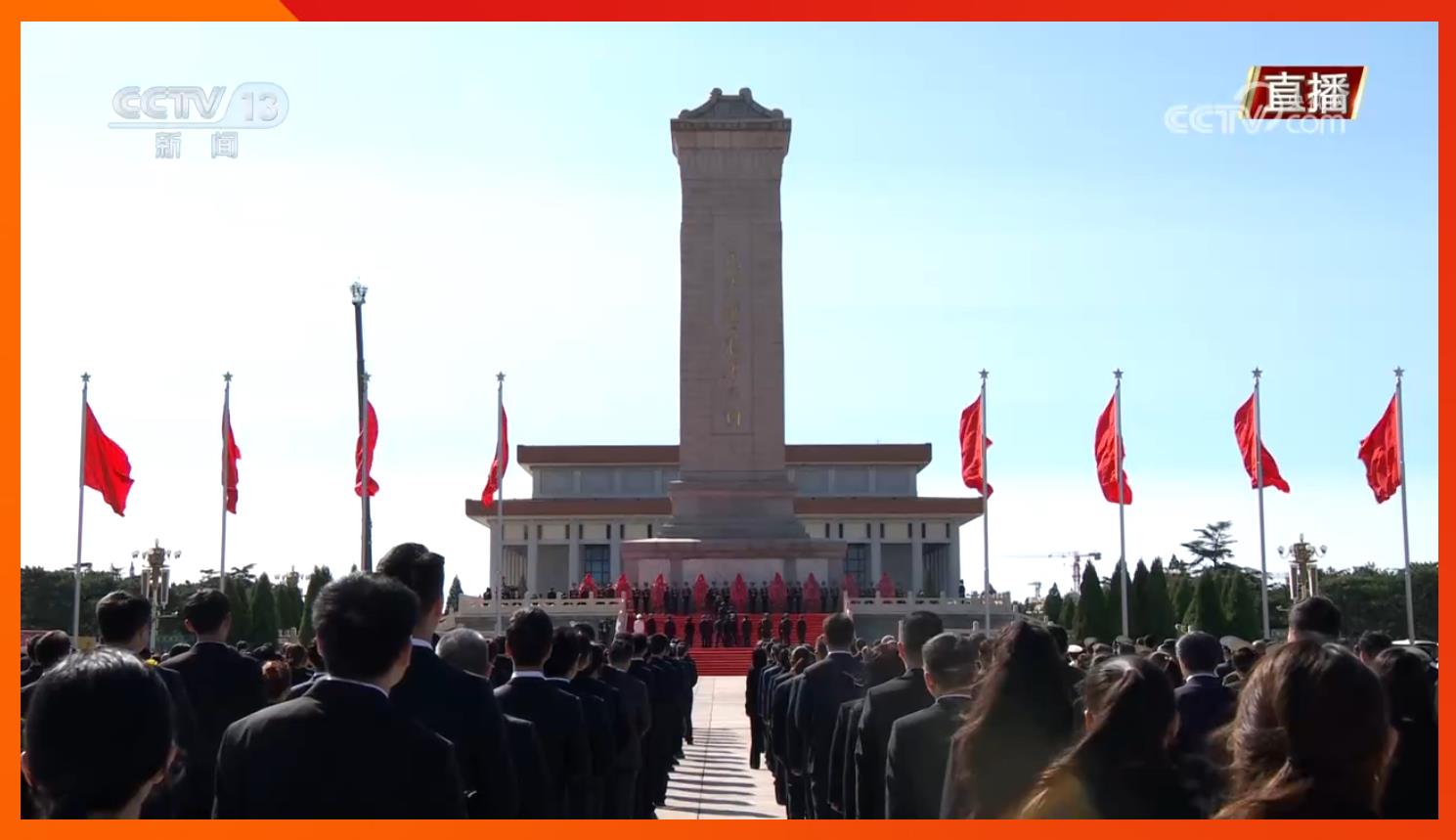 习近平迈步上前,仔细整理花篮缎带。随后,习近平等党和国家领导人缓步绕行,瞻仰人民英雄纪念碑。