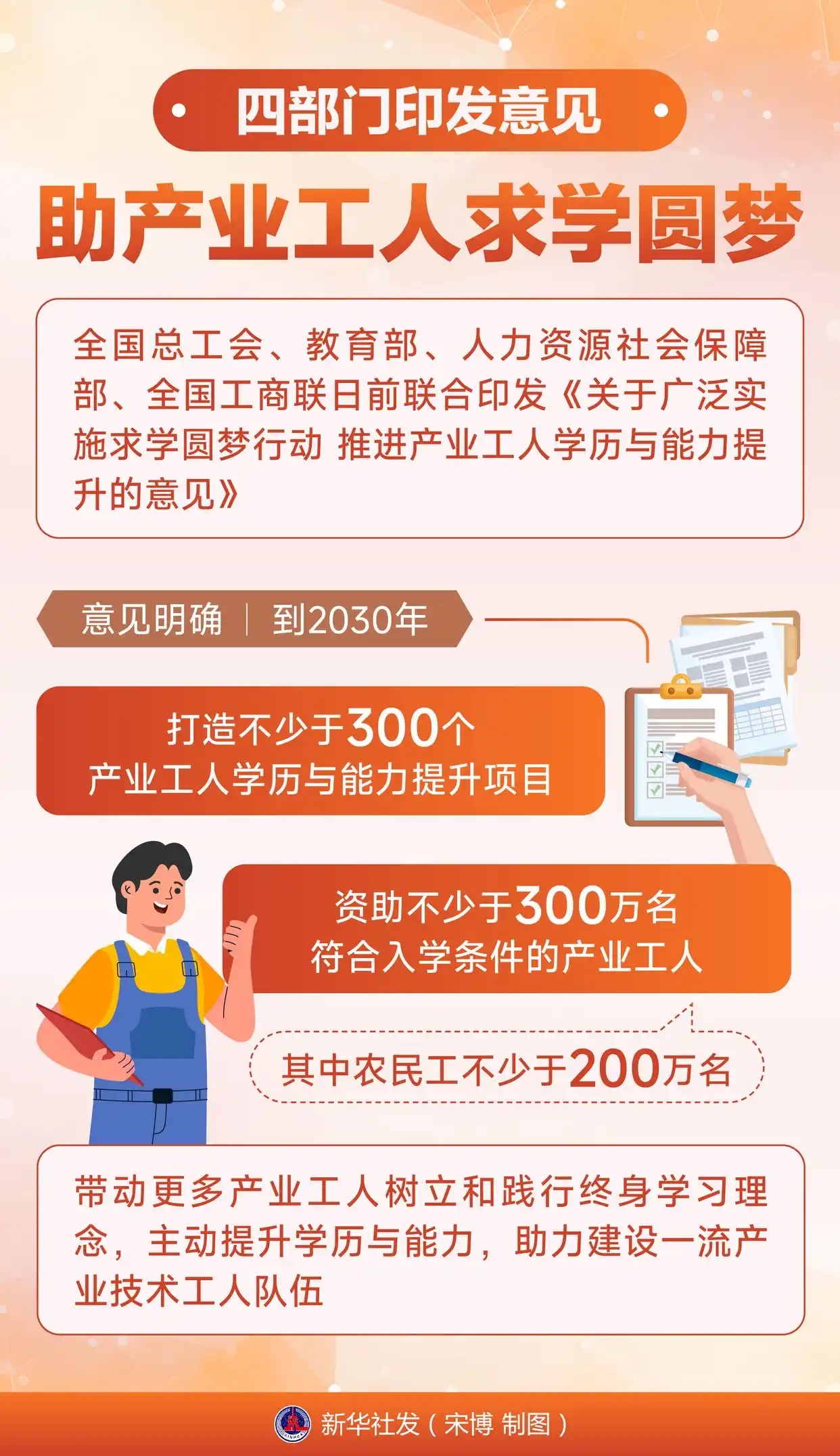 中工网北京4月3日电(工人日报—中工网记者郝赫)全国总工会、教育部、人力资源和社会保障部、全国工商联日前联合印发《关于广泛实施求学圆梦行动 ?推进产业工人学历与能力提升的意见》(以下简称《意见》),面向产业工人,提供高等学历继续教育和非学历教育。《意见》明确,到2030年,打造不少于300个产业工人学历与能力提升项目;资助不少于300万名符合入学条件的产业工人,其中农民工不少于200万名,带动更多产业工人树立和践行终身学习理念,主动提升学历与能力,助力建设一流产业技术工人队伍。4月2日,产业工人求学圆梦行动在北京正式启动。