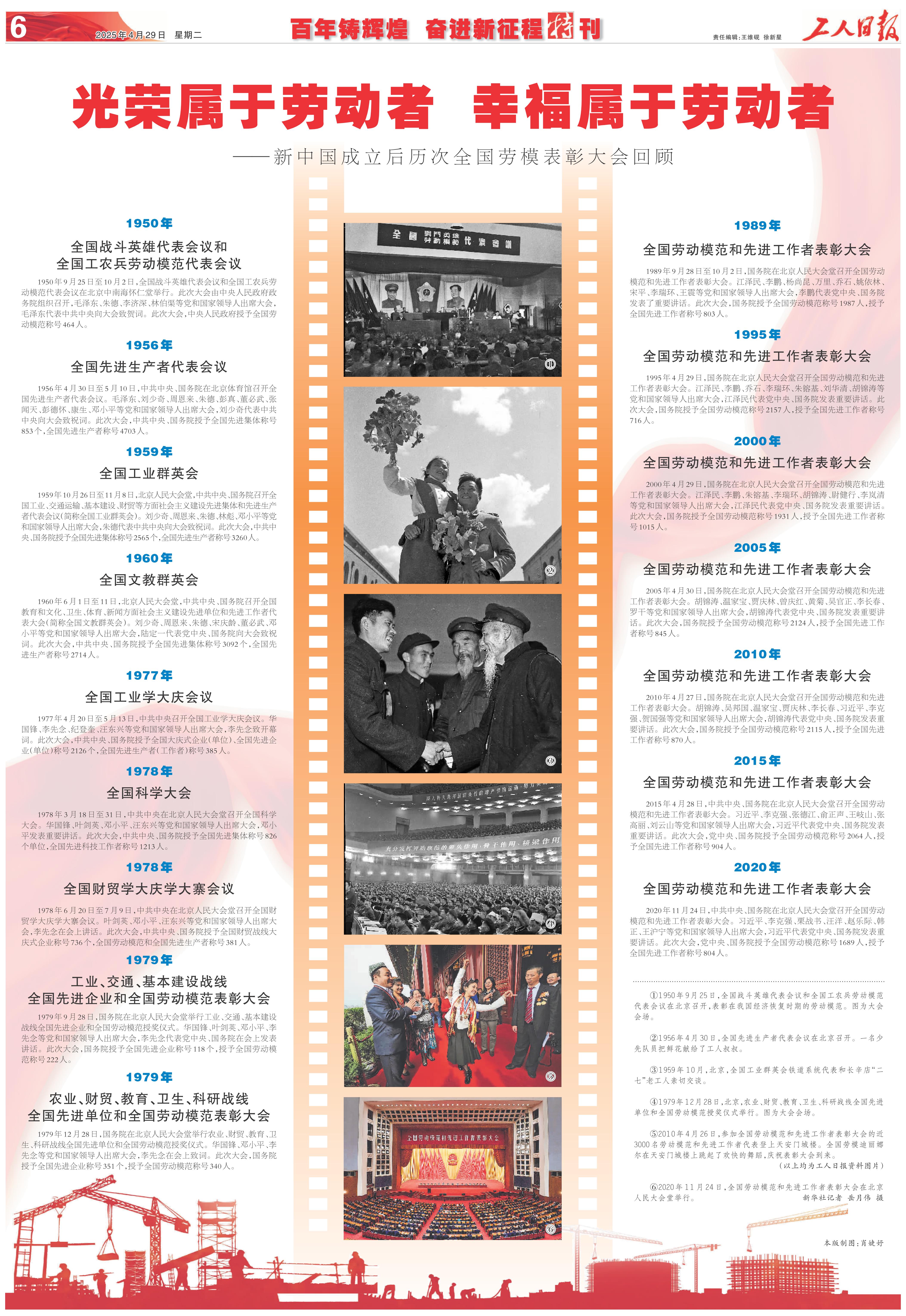 2020年11月24日,中共中央、国务院在北京人民大会堂召开全国劳动模范和先进工作者表彰大会。习近平、李克强、栗战书、汪洋、赵乐际、韩正、王沪宁等党和国家领导人出席大会,习近平代表党中央、国务院发表重要讲话。此次大会,党中央、国务院授予全国劳动模范称号1689人,授予全国先进工作者称号804人。