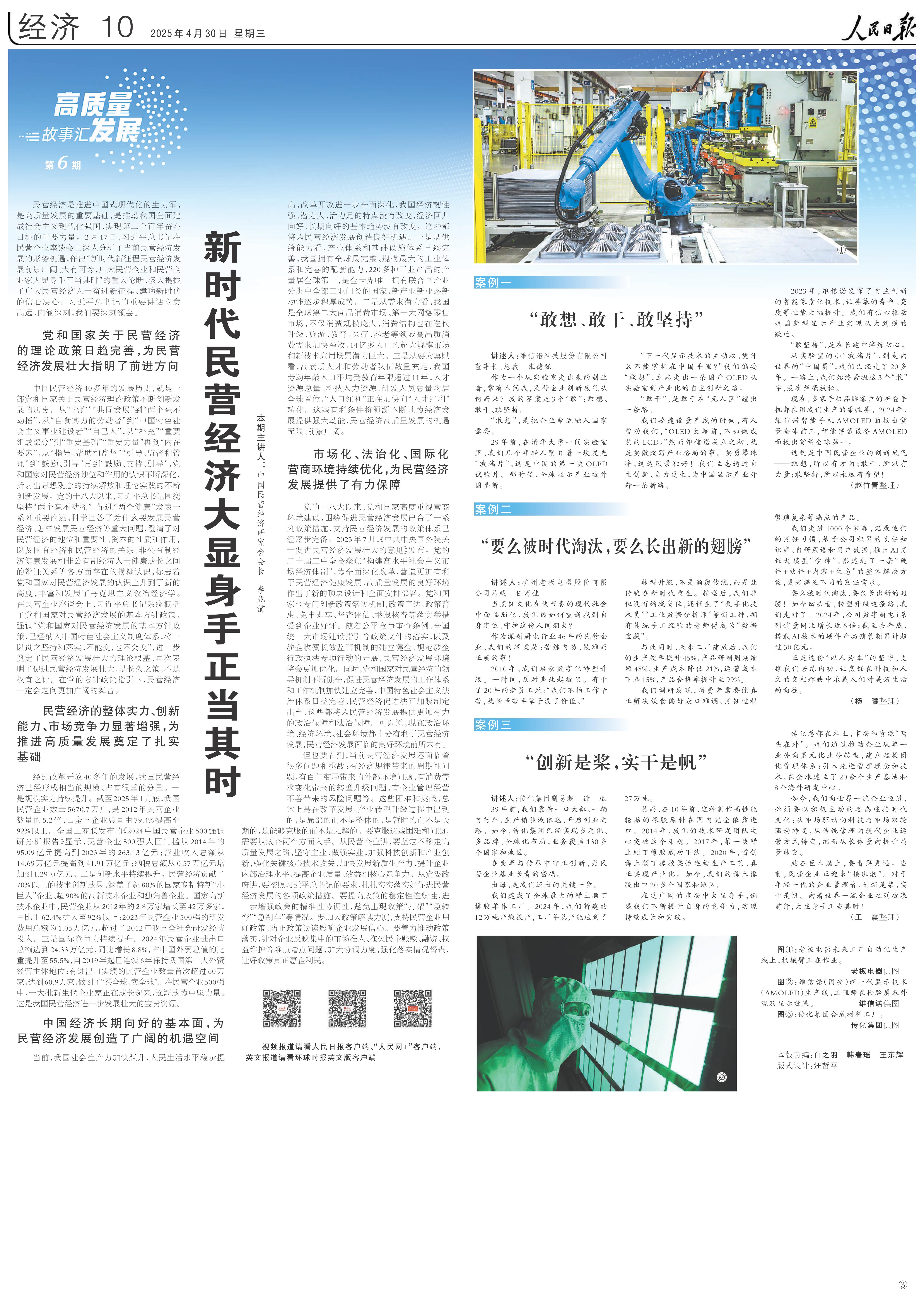 经过改革开放40多年的发展,我国民营经济已经形成相当的规模、占有很重的分量。一是规模实力持续提升。截至2025年1月底,我国民营企业数量5670.7万户,是2012年民营企业数量的5.2倍,占全国企业总量由79.4%提高至92%以上。全国工商联发布的《2024中国民营企业500强调研分析报告》显示,民营企业500强入围门槛从2014年的95.09亿元提高到2023年的263.13亿元;营业收入总额从14.69万亿元提高到41.91万亿元;纳税总额从0.57万亿元增加到1.29万亿元。二是创新水平持续提升。民营经济贡献了70%以上的技术创新成果,涵盖了超80%的国家专精特新“小巨人”企业、超90%的高新技术企业和独角兽企业。国家高新技术企业中,民营企业从2012年的2.8万家增长至42万多家,占比由62.4%扩大至92%以上;2023年民营企业500强的研发费用总额为1.05万亿元,超过了2012年我国全社会研发经费投入。三是国际竞争力持续提升。2024年民营企业进出口总额达到24.33万亿元,同比增长8.8%,占中国外贸总值的比重提升至55.5%,自2019年起已连续6年保持我国第一大外贸经营主体地位;有进出口实绩的民营企业数量首次超过60万家,达到60.9万家,做到了“买全球、卖全球”。在民营企业500强中,一大批新生代企业家正在成长起来,逐渐成为中坚力量。这是我国民营经济进一步发展壮大的宝贵资源。