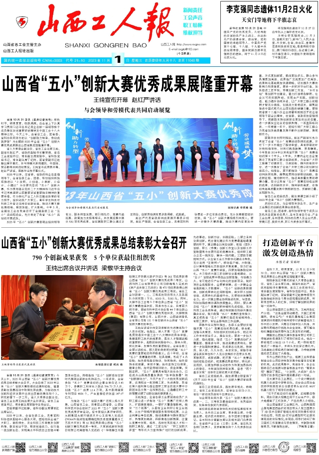 本报10月31日讯(首席记者吴艳)深秋时节,硕果累累、收获满满。在全省上下认真学习贯彻习近平总书记同全总新一届领导班子成员集体谈话重要讲话精神及中国工会十八大精神之际,今天上午,由省总工会、团省委、省科协共同举办的以“创新助力转型、劳动成就梦想”为主题的2023年全省“五小”创新大赛优秀成果展在山西省展览馆隆重开幕。