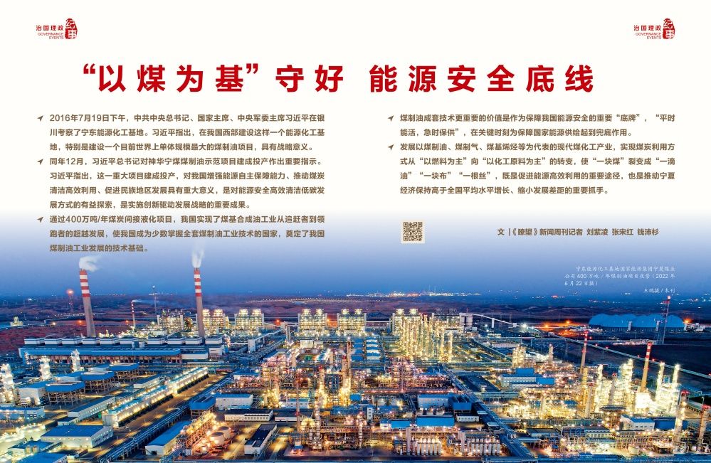 ◇2016年7月19日下午,中共中央总书记、国家主席、中央军委主席习近平在银川考察了宁东能源化工基地。习近平指出,在我国西部建设这样一个能源化工基地,特别是建设一个目前世界上单体规模最大的煤制油项目,具有战略意义。