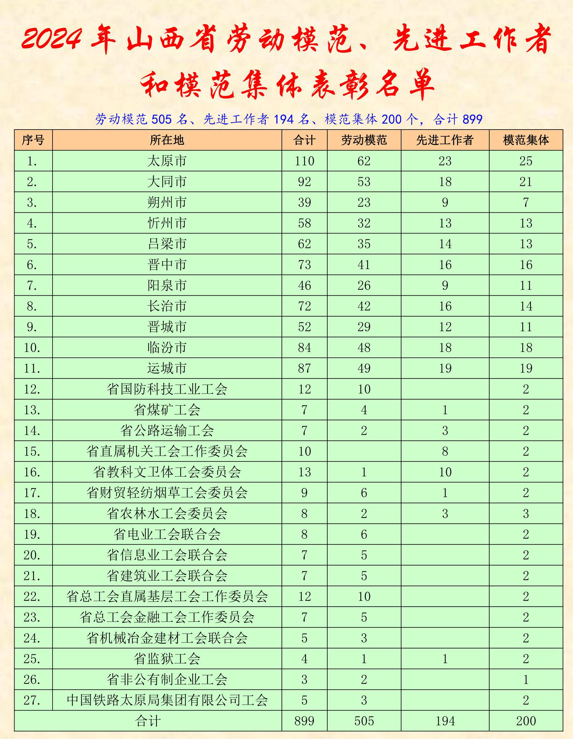 根据《中共山西省委办公厅、山西省人民政府办公厅关于做好2024年山西省劳动模范、先进工作者和模范集体评选表彰工作的通知》要求,为体现公开、公平、公正原则,充分发扬民主、广泛听取意见、接受社会监督,现将2024年山西省劳动模范、先进工作者和模范集体拟表彰对象予以公示。若对公示对象有异议,请自公示之日起,在5个工作日内通过电话、电子邮件或信函等方式反映。反映情况须实事求是,提供具体线索或事实依据,提倡实名举报。