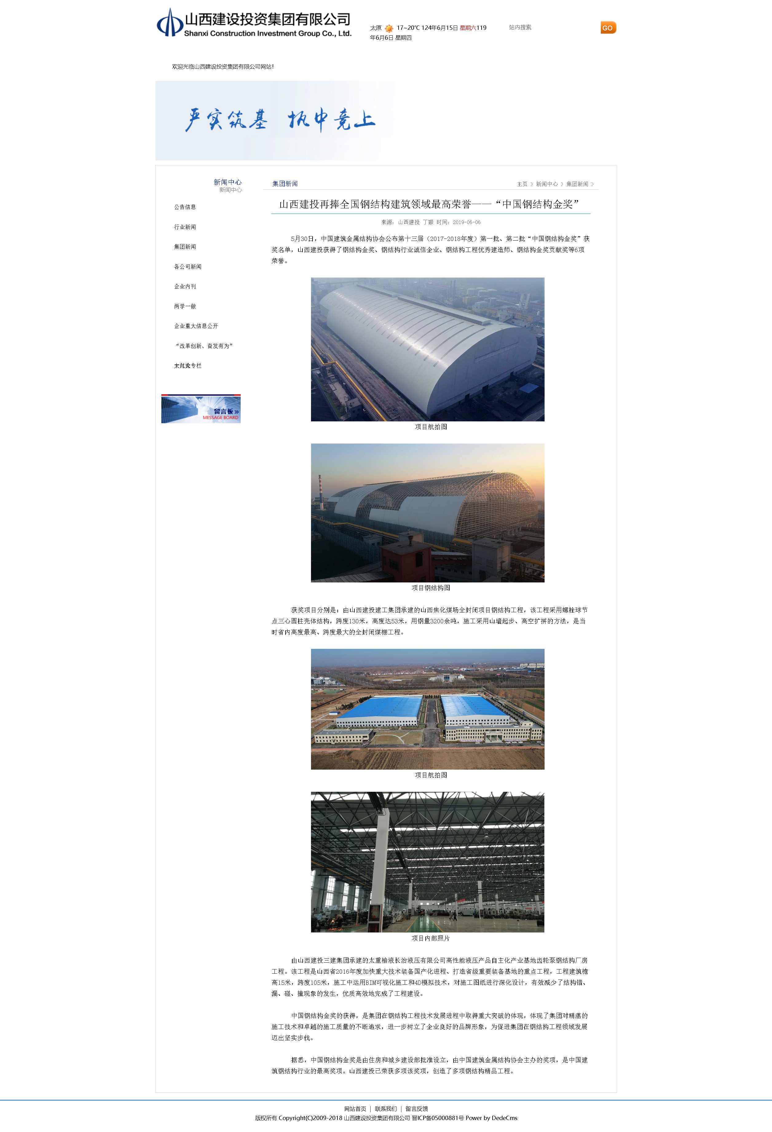 目前,山西三建集团已累计荣获五项中国钢结构金奖。这些殊荣的获得不仅是对三建钢构板块信誉和综合实力的认可,更是对企业品牌效应和建设项目品质的充分肯定。同时,这些奖项不仅展示了集团公司在工程管理、技术水平、施工规模等方面的综合实力,也进一步凸显了集团公司在推动城市建设方面所作出的重要贡献。未来,集团公司将倍加珍惜荣誉,再接再厉,不断提升管理水平、打造精品工程,为我国建筑钢结构事业的持续健康发展做出新的更大贡献。(赵孟然)