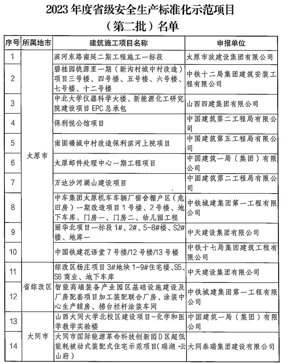 根据《山西省住房和城乡建设厅建筑施工安全生产标准化创建和考评实施细则》,经企业自主申报,省厅组织专家资料审查、现场核查,评定山西一建集团有限公司等14个企业为2023年度“省级安全生产标准化示范企业”,评定滨河东路南延二期工程施工一标段等38个项目为2023年度第二批“省级安全生产标准化示范项目”,且经公示无异议,现将名单予以公布。