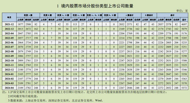 截至4月末,境内股票市场共有上市公司5372家,沪、深、北证券交易所分别为2272、2852、248家。分股份类型统计,仅发A股公司5139家,仅发B股公司11家,A+B、A+H等多股份类型的公司222家;分控股类型,国有控股和非国有控股公司数量分别占比26%、74%;按省域划分,广东、浙江、江苏上市公司家数分别为874、707、696家,汇集超40%上市公司。(记者姚均芳)