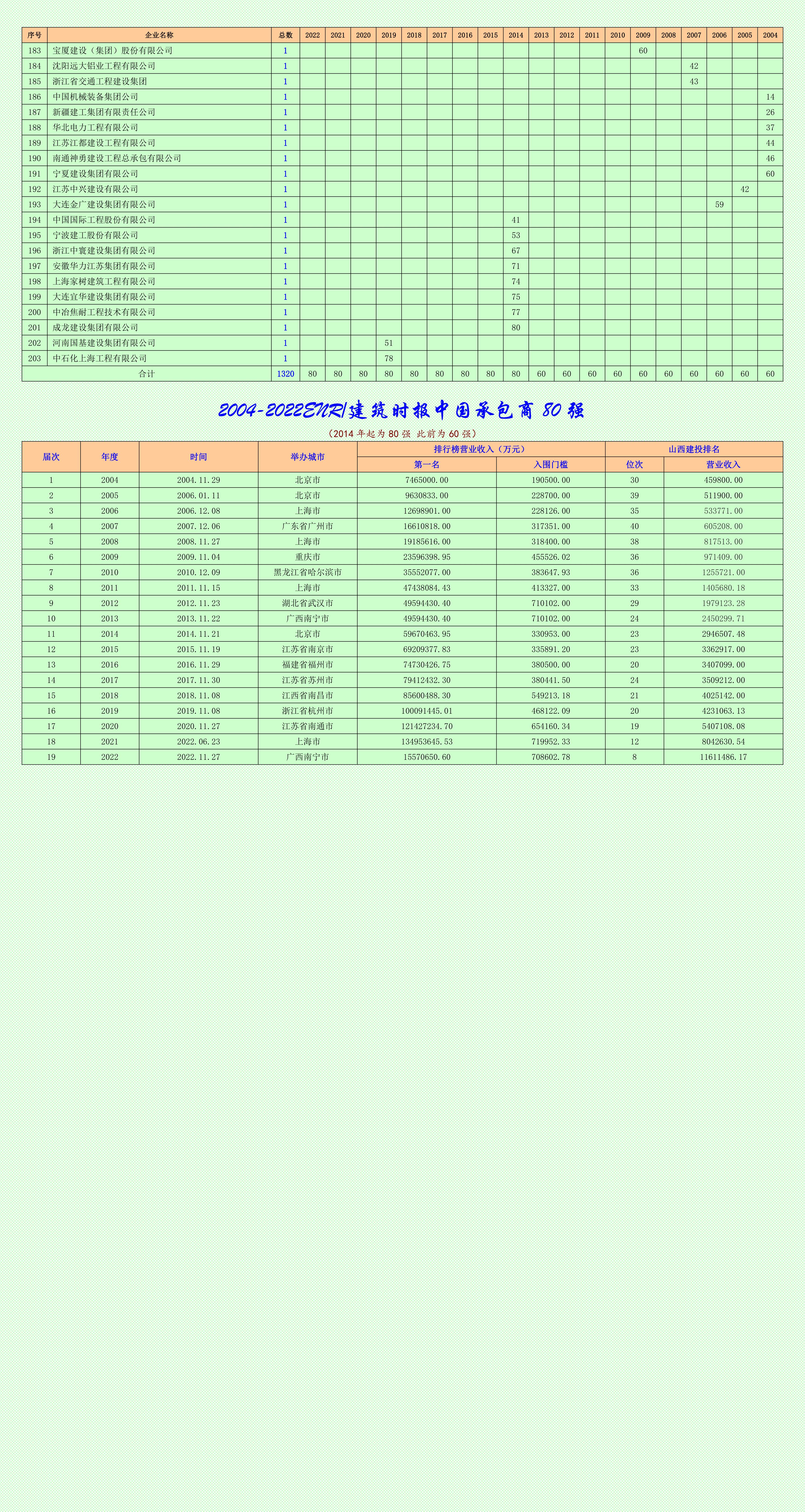 2004-2022ENR/建筑时报中国承包商 80 强统计表