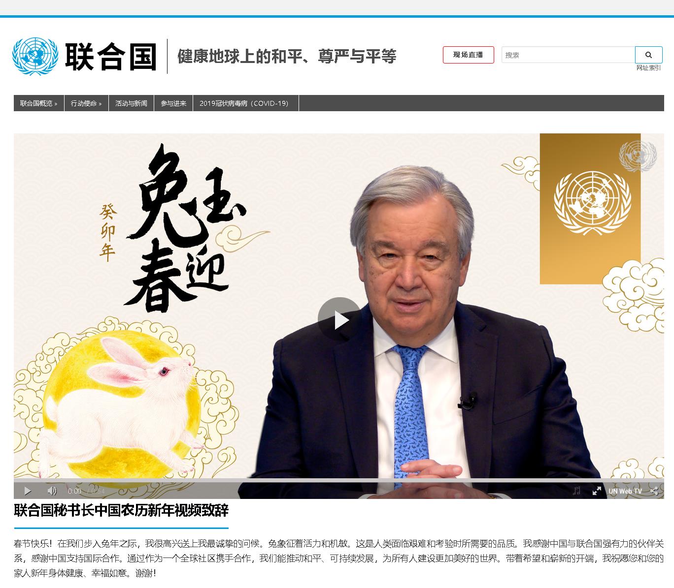 春节快乐!在我们步入兔年之际,我很高兴送上我最诚挚的问候。兔象征着活力和机敏。这是人类面临艰难和考验时所需要的品质。我感谢中国与联合国强有力的伙伴关系,感谢中国支持国际合作。通过作为一个全球社区携手合作,我们能推动和平、可持续发展,为所有人建设更加美好的世界。带着希望和崭新的开端,我祝愿您和您的家人新年身体健康、幸福如意。谢谢!