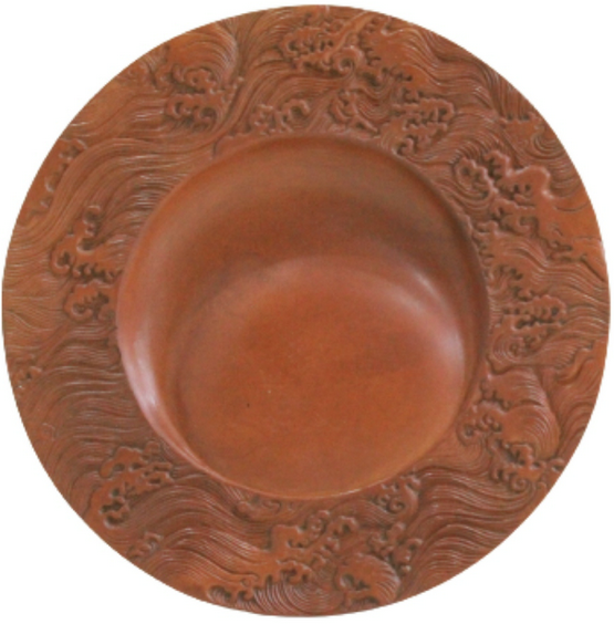 此次获得“世界杰出手工艺品徽章”的“日月同辉砚”,造型别致,砚质细润。其整体呈圆形,中心砚堂圆润,砚岗微凸如浩日东升,上部墨池呈弧形凹陷,又似一轮弯月,砚堂周边浮雕浪涛翻滚,极为生动传神,如日月交辉浑然天成,寓意吉祥。作品构思巧妙,雕工精湛,繁简有序,别有风韵。