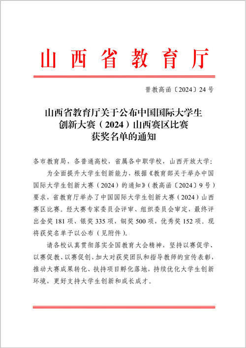 为全面提升大学生创新能力,根据教育部相关通知要求,省教育厅举办了中国国际大学生创新大赛(2024)山西赛区比赛。经大赛专家委员会评审、组织委员会审定,最终评出金奖181项、银奖335项、铜奖500项、优秀奖152项。省教育厅日前公布了获奖名单。