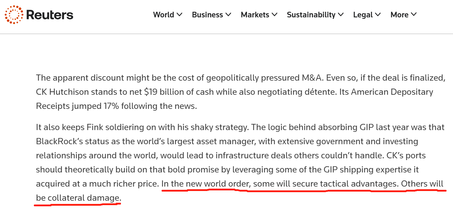 路透社这样的媒体还毫不顾忌地给出分析:此次贝莱德拿到这样“明显的折扣”,可能是地缘政治压力所致。
