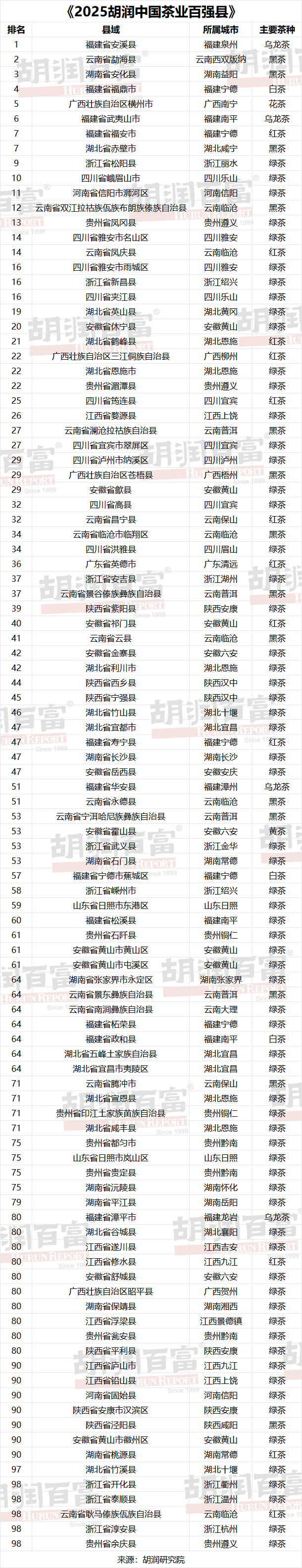 《2025胡润中国茶业百强县》调研范围为所有中国县级行政单位。信息来源为行业公开信息,评估标准包括地区茶业产值、地区茶企整体数量、地区规上茶企数量。去年,胡润研究院发布的《胡润国茶百亿县》中,共有10个茶业综合产值超100亿元人民币的县级单位上榜。