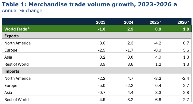 从地区来看,亚洲经济体2025年将继续成为全球货物贸易增长的最大引擎,而北美地区今明两年将持续拖累全球贸易增长,欧洲对今年全球贸易增长也将产生轻微负面影响。