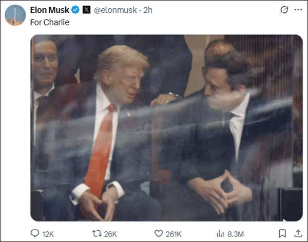 公开闹翻几个月后,美国总统特朗普与知名企业家马斯克于9月21日在查理·柯克追悼会现场同框亮相,两人相邻而坐并握手交谈。