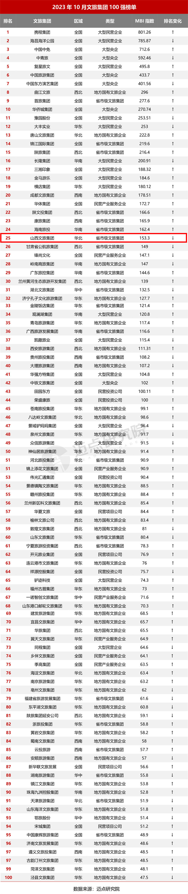近日,“2023年10月文旅集团全国100强榜单”出炉,山西文旅集团榜上有名,居第25位。
