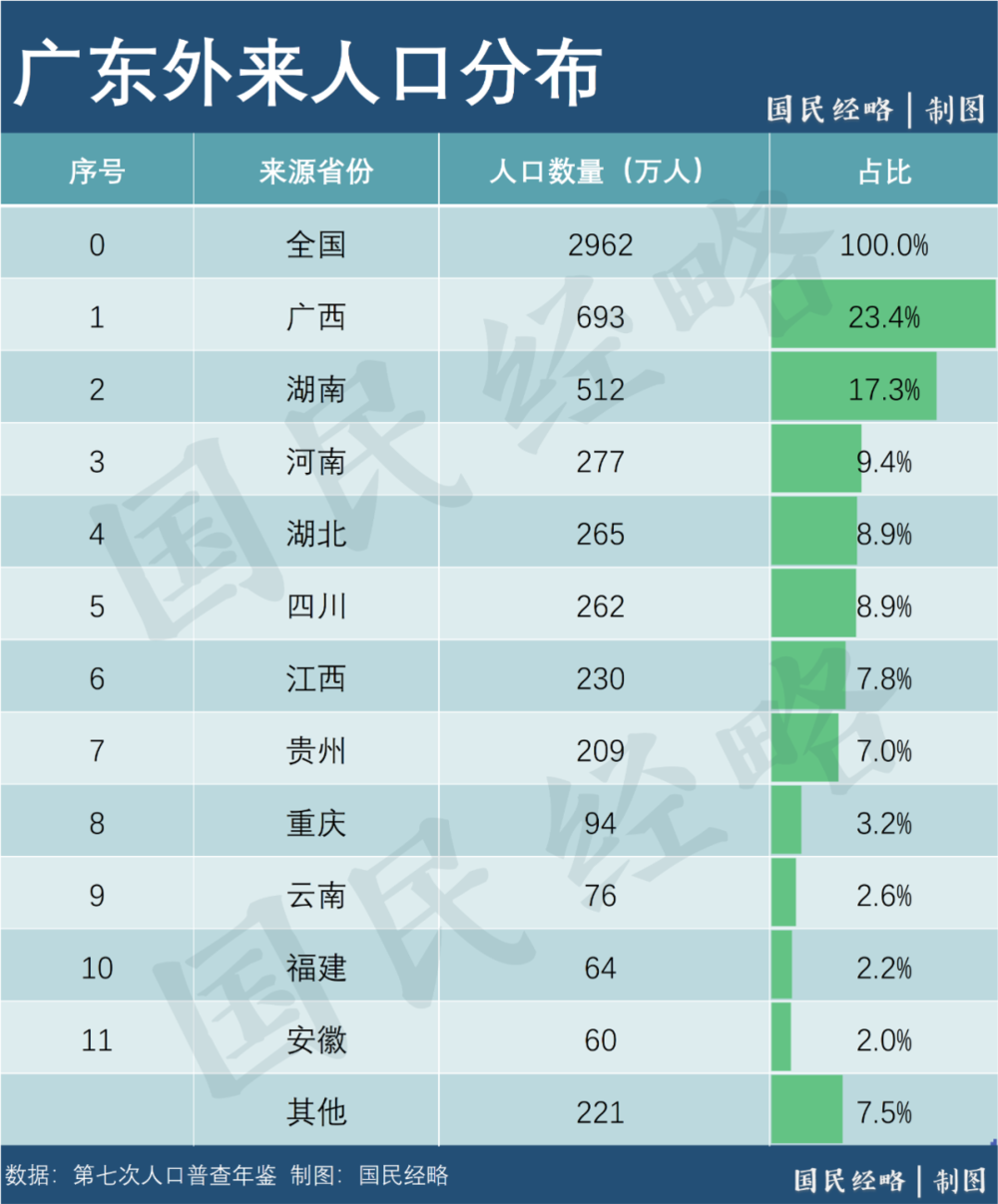 七普数据显示,广东外来人口总规模高达2962万人,占总人口的1/4左右。