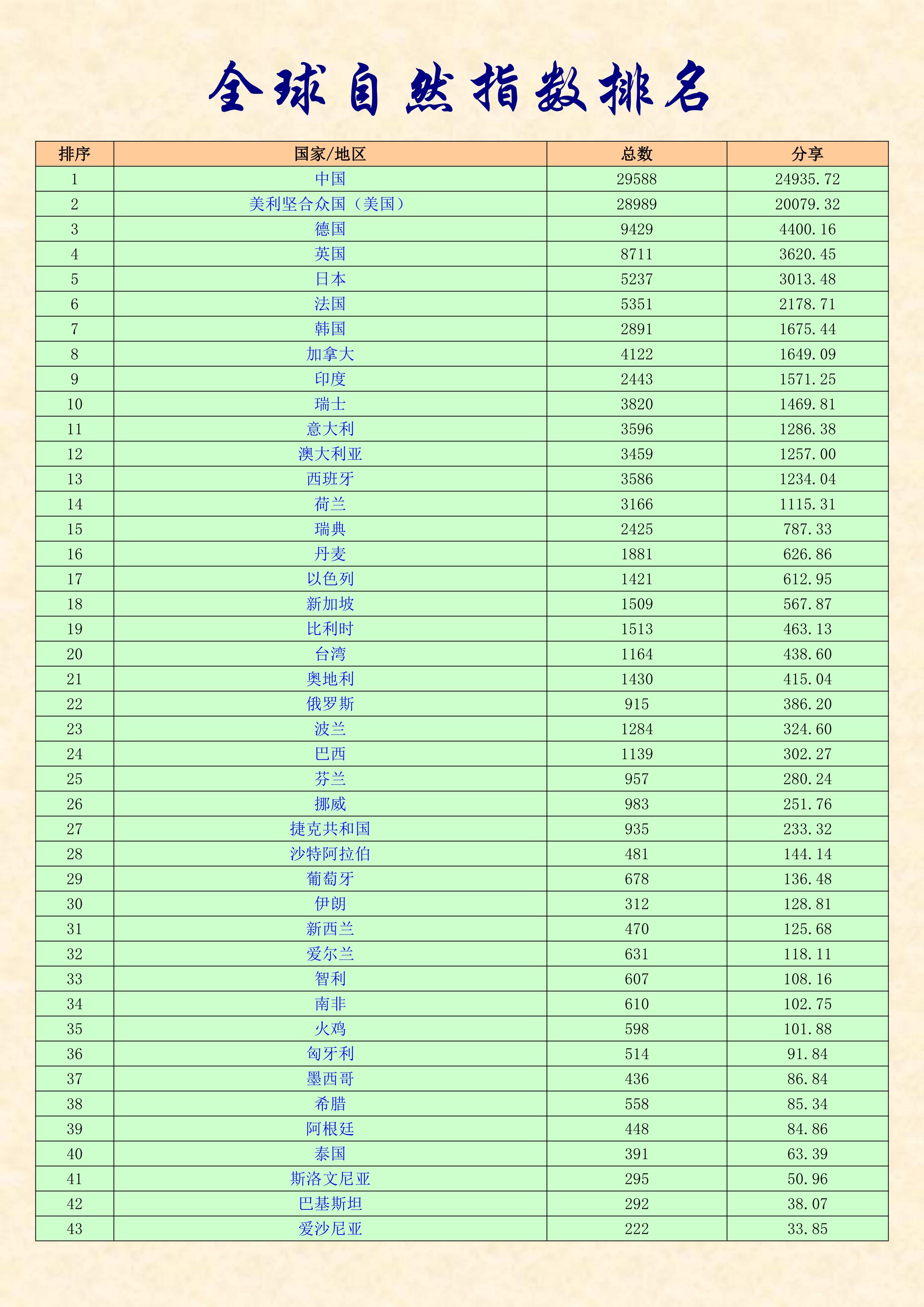 自然指数(Nature Index)于2014年11月首次发布,是依托于全球100多种顶级期刊(2014年11月开始选定68种,2018年6月改为82种 ,2023年收录期刊总数增至145种),统计各高校、科研院所(国家)在国际上最具影响力的研究型学术期刊上发表论文数量的数据库。运用这个数据库,可以根据各机构的论文发表数量及类别来进行排名和期刊索引,这一数据库的实时在线版免费为公众开放。自然指数已发展成为国际公认的、能够衡量机构、国家和地区在自然科学领域的高质量研究产出与合作情况的重要指标,在全球范围内有很大影响力。