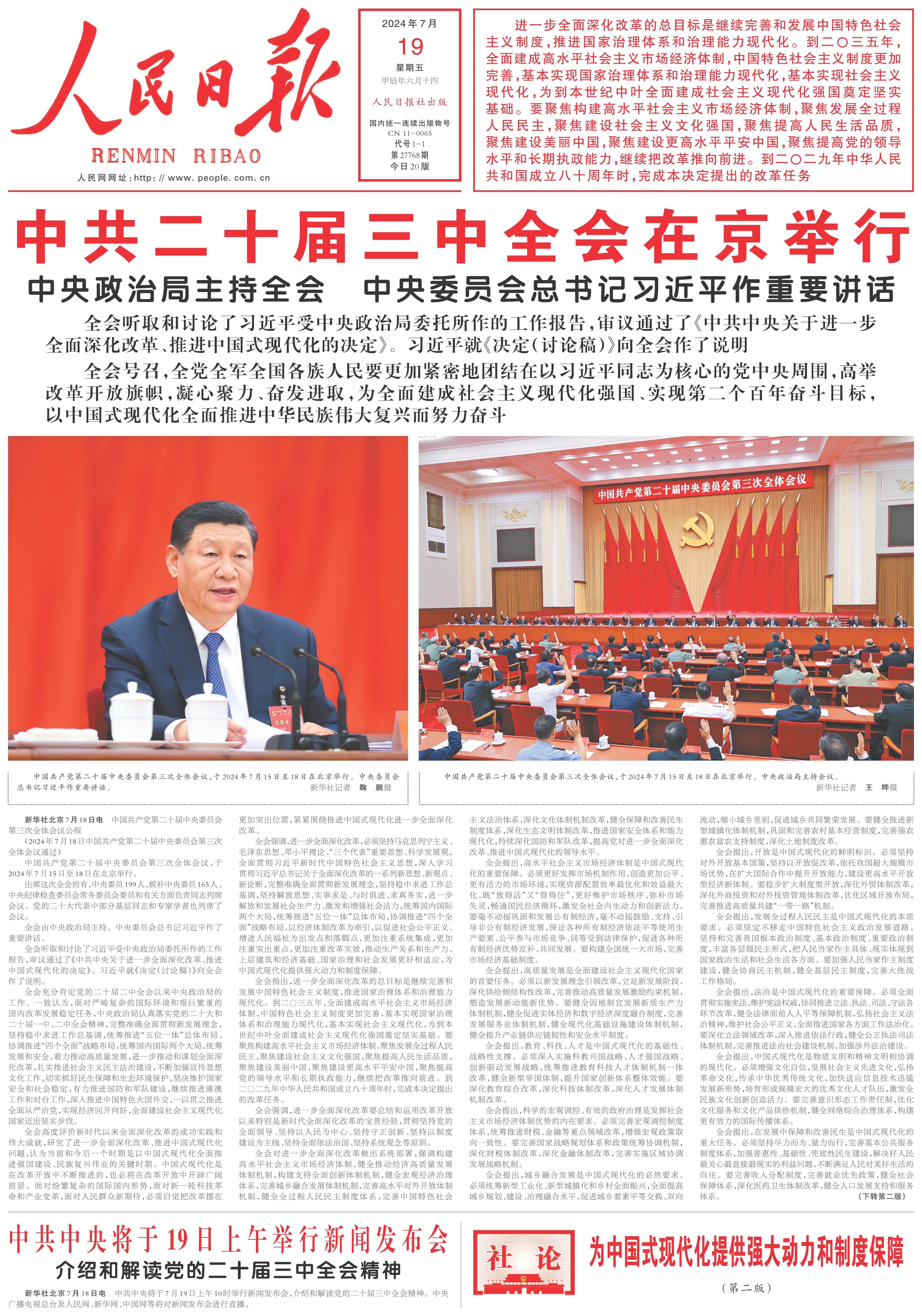 中国共产党第二十届中央委员会第三次全体会议,于2024年7月15日至18日在北京举行。