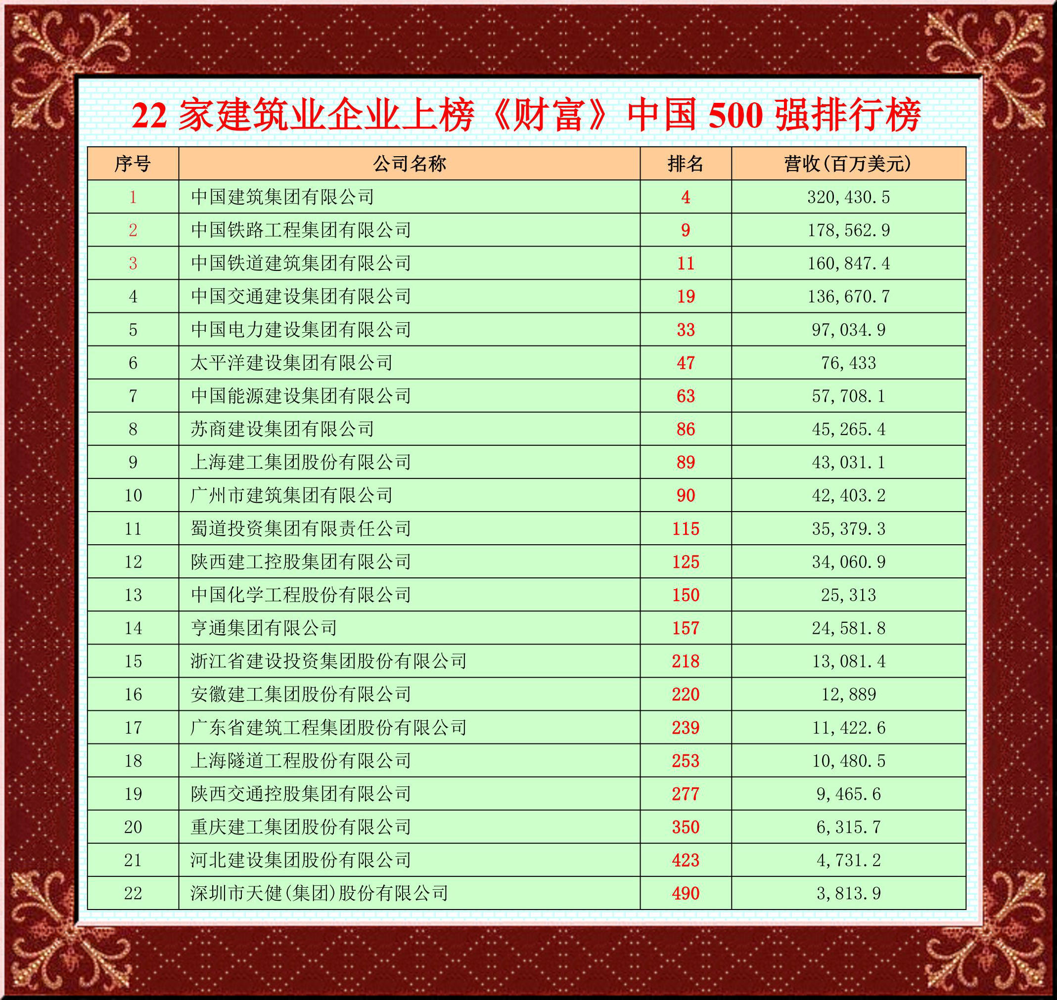 今天发榜的2024年《财富》中国500强排行榜,其中有我们建筑业行业企业22家,大家看看都是谁家。