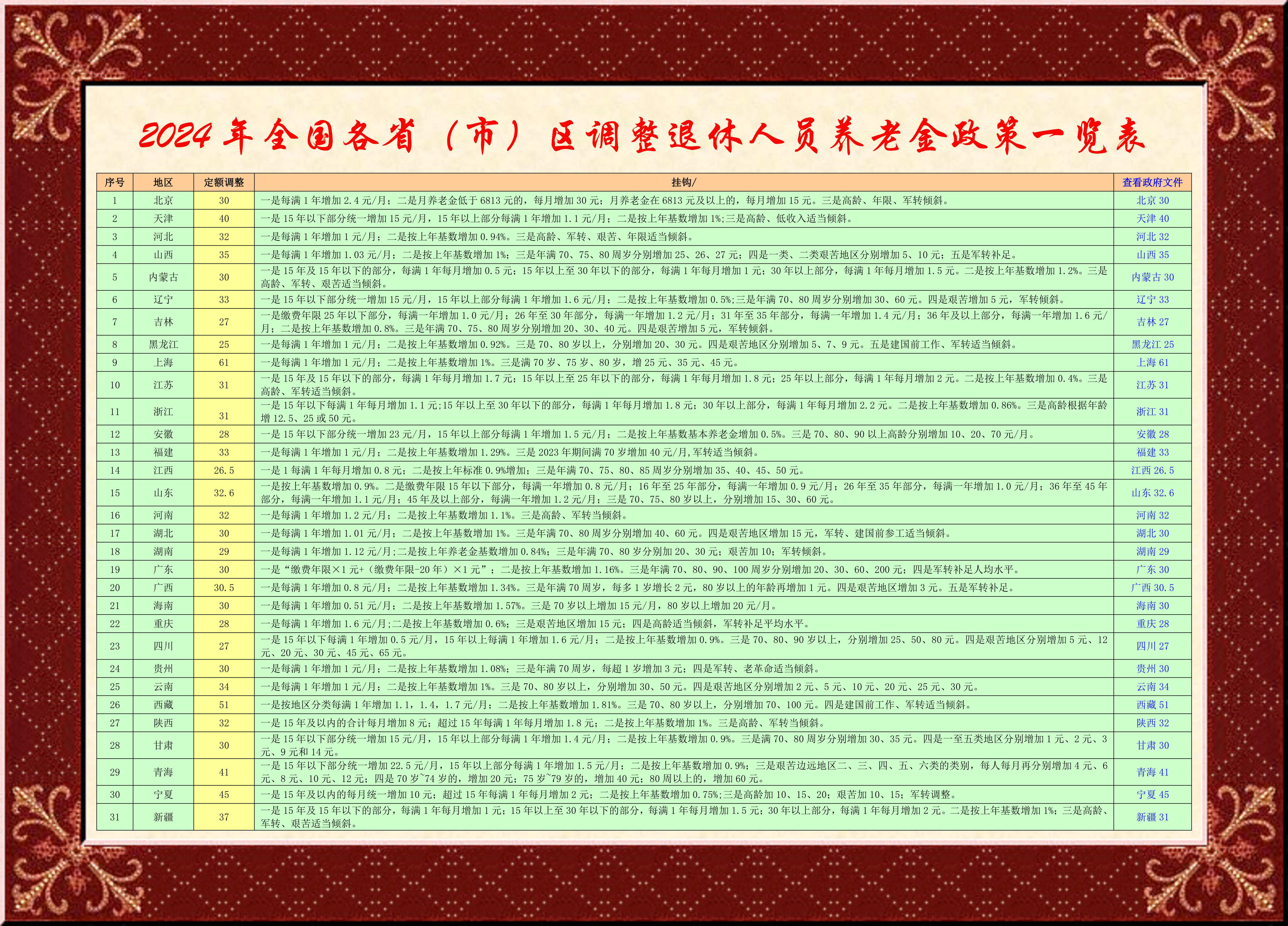 2024年全国31个省(市)自治区退休人员调整基本养老金已经落实到位,一年一度1.4亿退休人员得到了实实在在的实惠,这是党中央和各级人民政府把人民生活放在第一位的伟大功绩,可圈可点,令人欣慰!