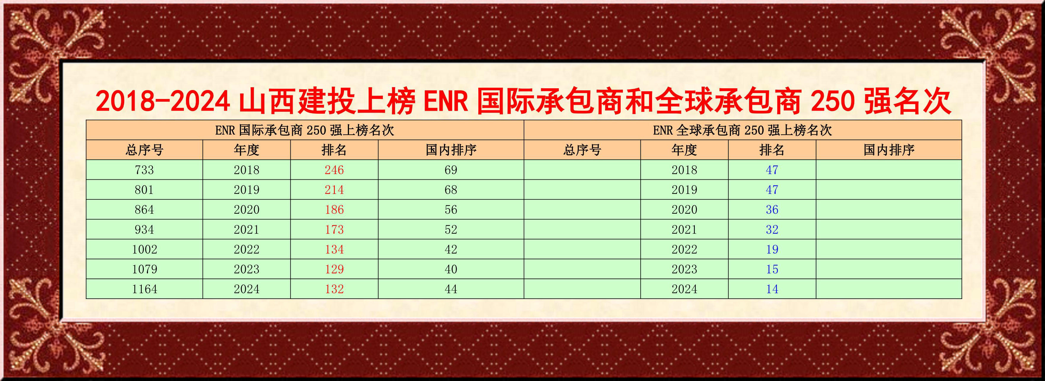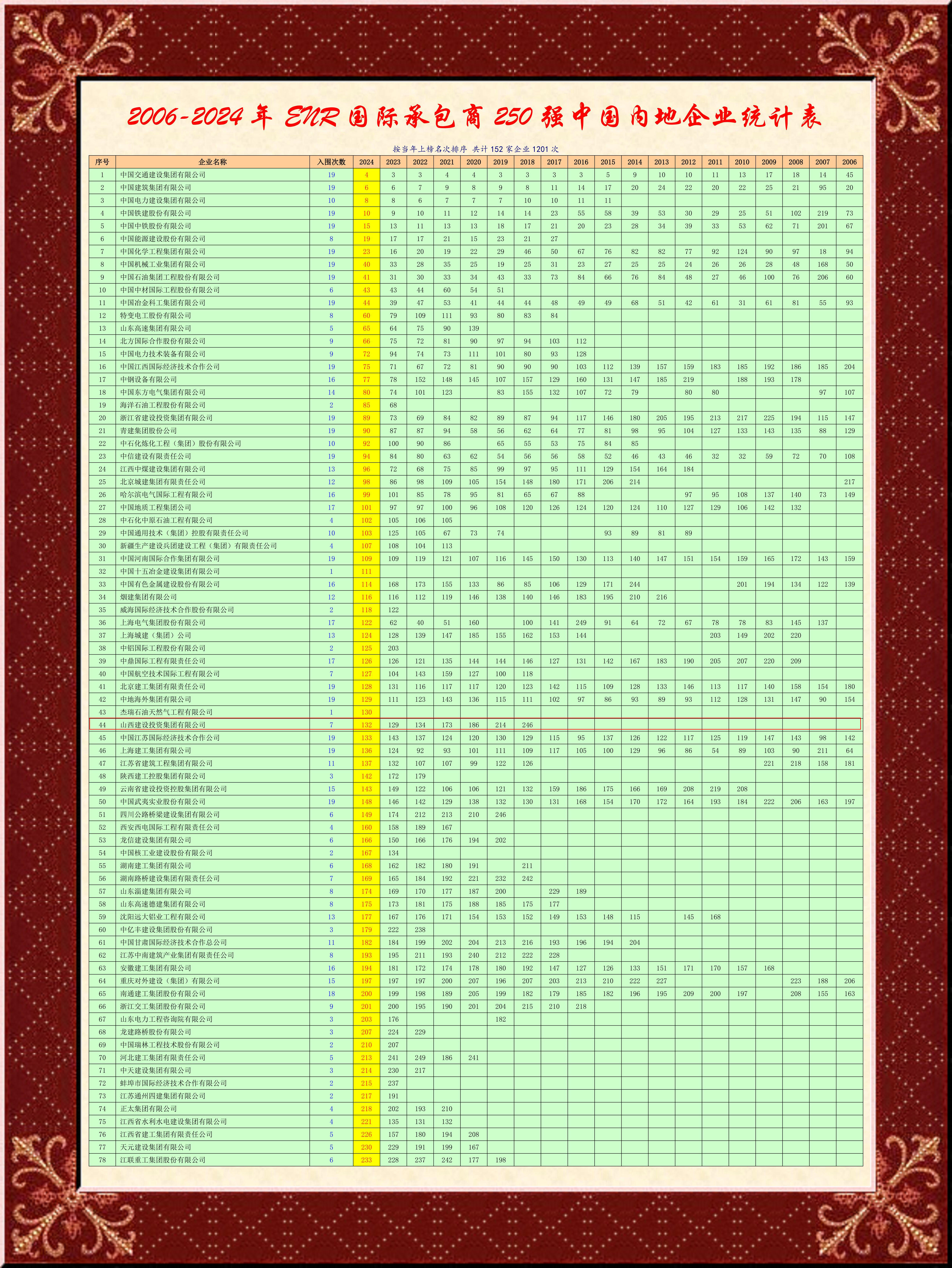 2006-2024年ENR国际承包商250强中国内地企业统计表