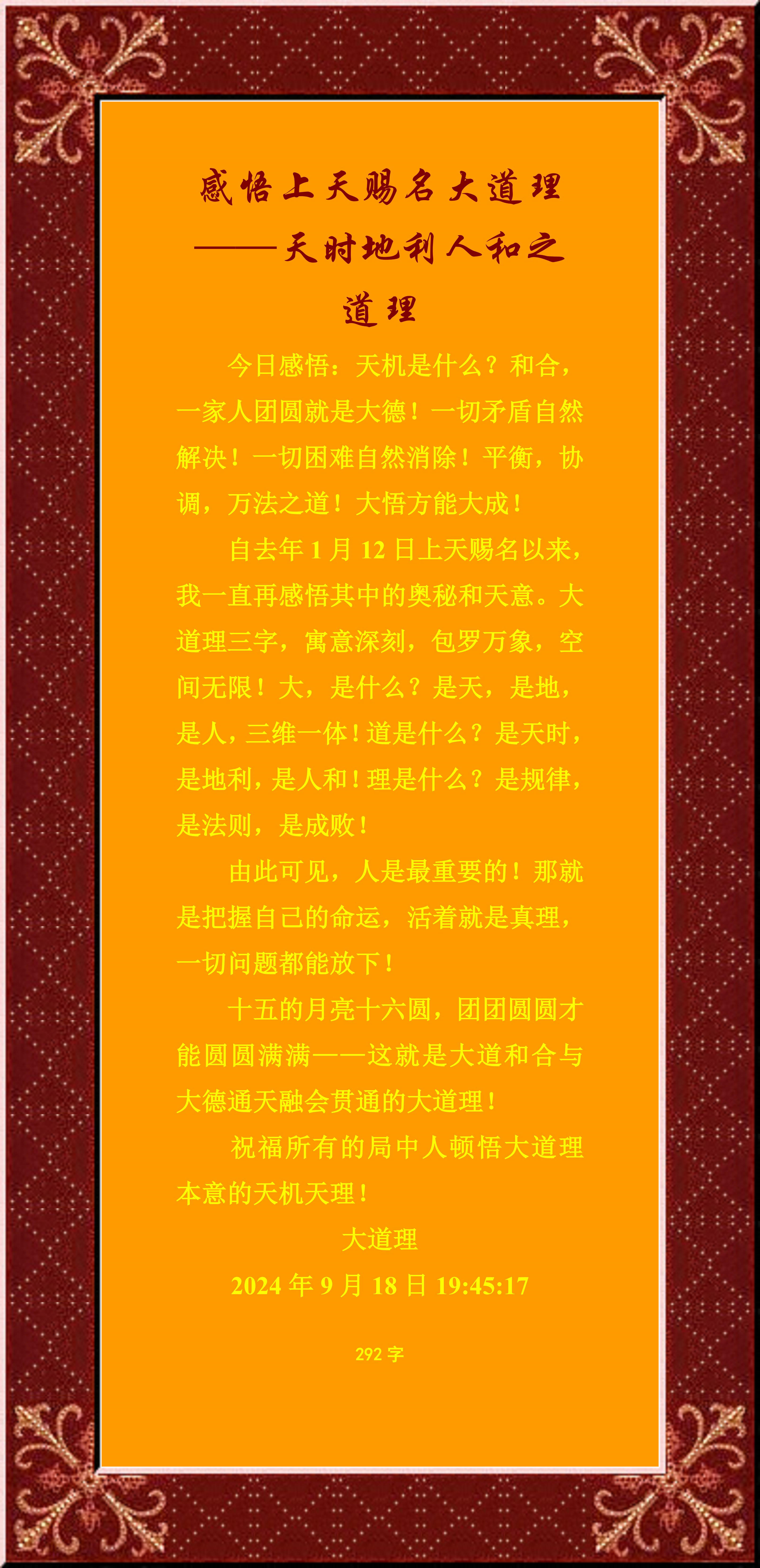今日感悟:天机是什么?和合,一家人团圆就是大德!一切矛盾自然解决!一切困难自然消除!平衡,协调,万法之道!大悟方能大成!