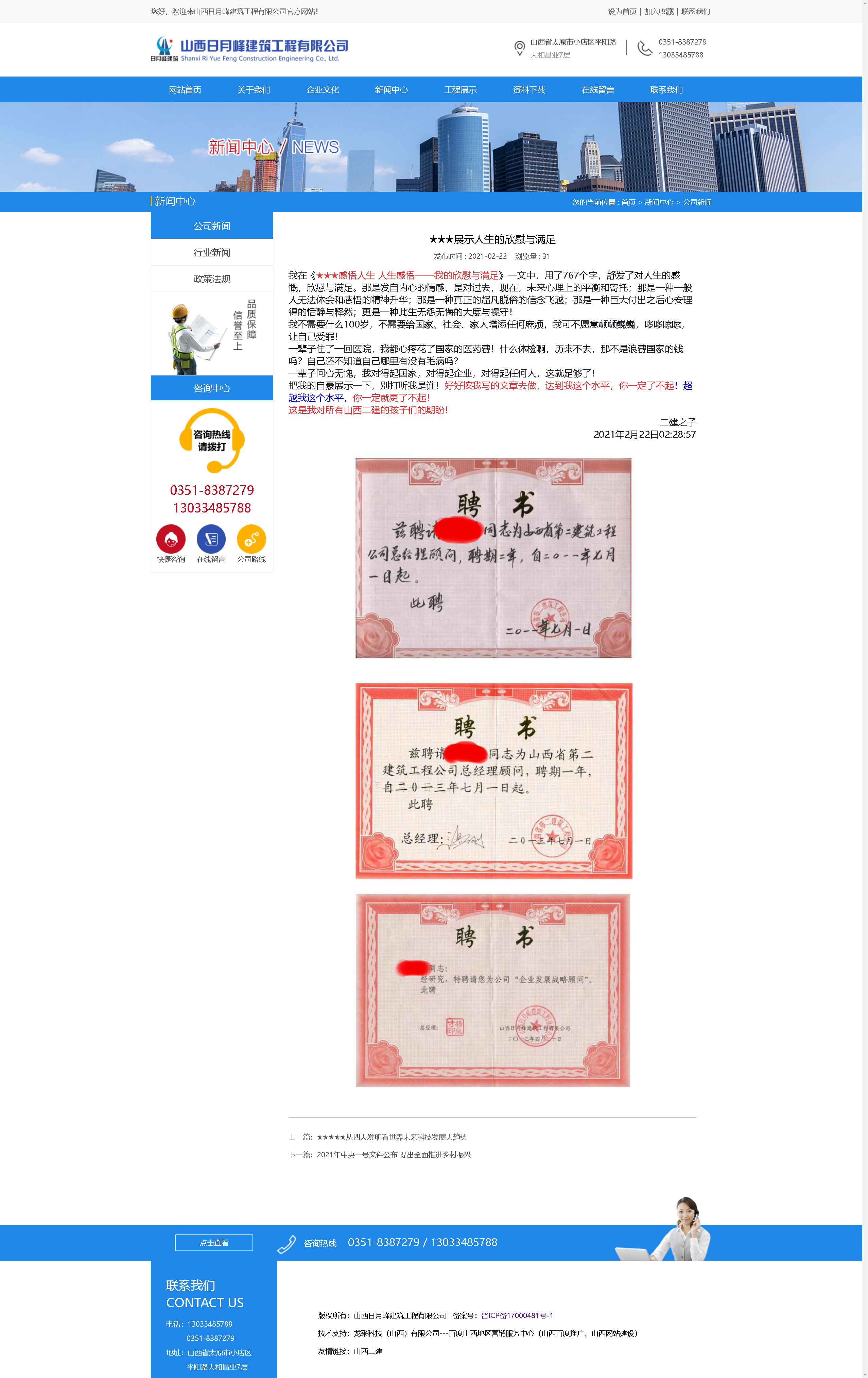 回顾以往,从18岁进入省建,四十年后的2011年担任山西省第二建筑工程公司总经理发展战略顾问,到2012年退休返聘,如今依然是在岗不在册的二建员工,这是我最看重和欣慰的第一件荣誉!从退休后第二年,又担任河南东方建设集团太原分公司和山西日月峰建筑工程有限公司总经理发展战略顾问,再到我亲自谋略的山西k1体育建设发展有限公司战略顾问,五十五年就是这样走过来的,普普通通,平平凡凡!