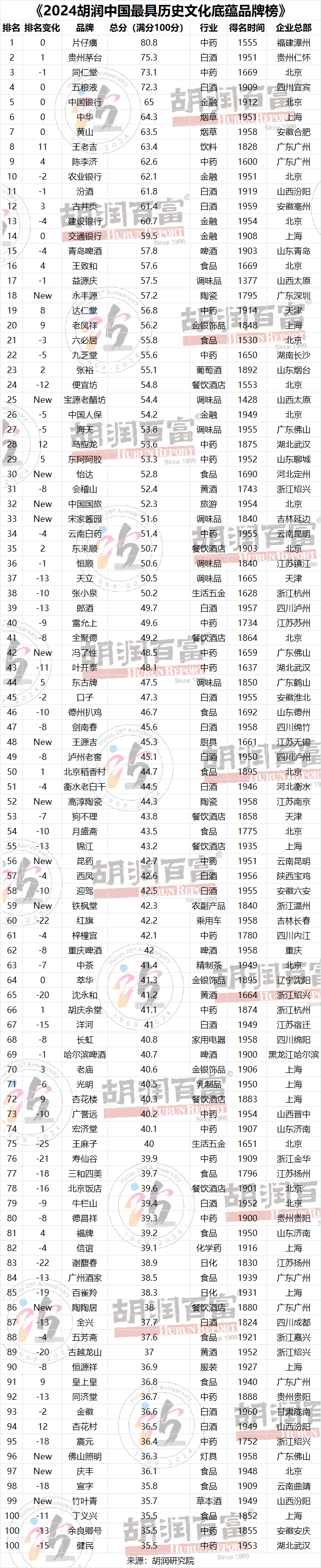 排名 品牌 创始年代 品牌年代 总部所在地 行业 2024排名 得分