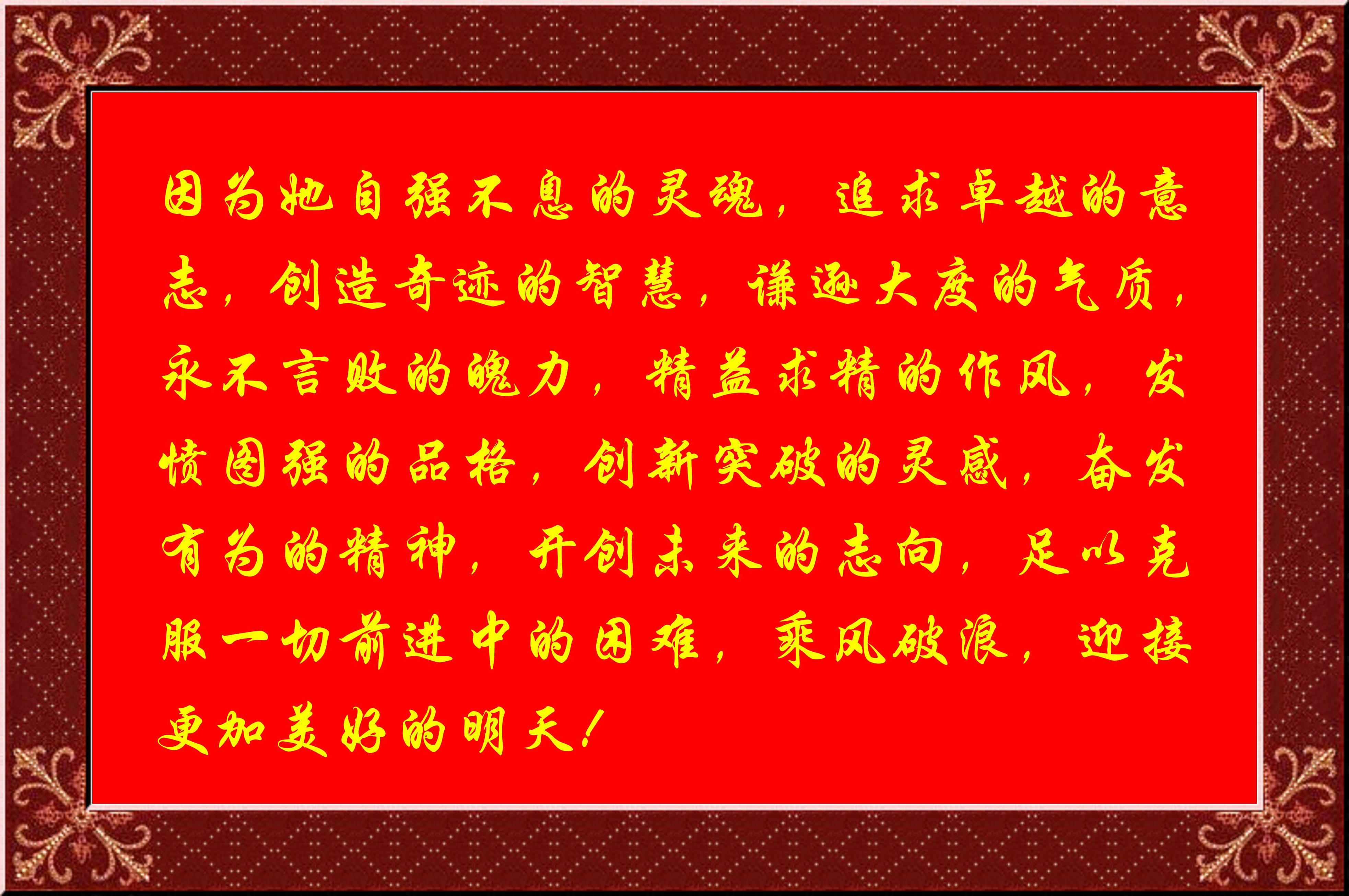 因为她自强不息的灵魂,追求卓越的意志,创造奇迹的智慧,谦逊大度的气质,永不言败的魄力,精益求精的作风,发愤图强的品格,创新突破的灵感,奋发有为的精神,开创未来的志向,足以克服一切前进中的困难,乘风破浪,迎接更加美好的明天!