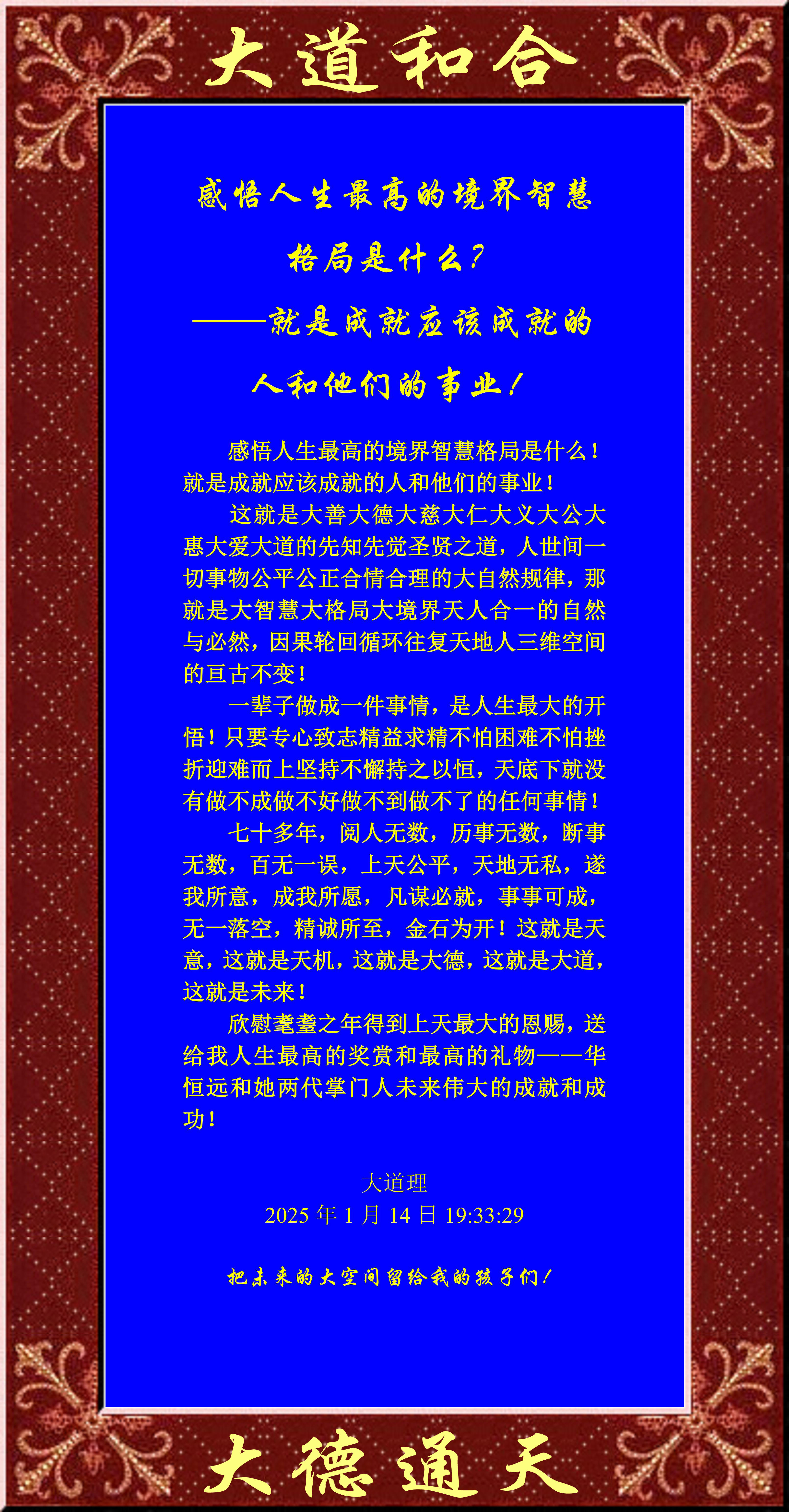 七十多年,阅人无数,历事无数,断事无数,百无一误,上天公平,天地无私,遂我所意,成我所愿,凡谋必就,事事可成,无一落空,精诚所至,金石为开!这就是天意,这就是天机,这就是大德,这就是大道,这就是未来!