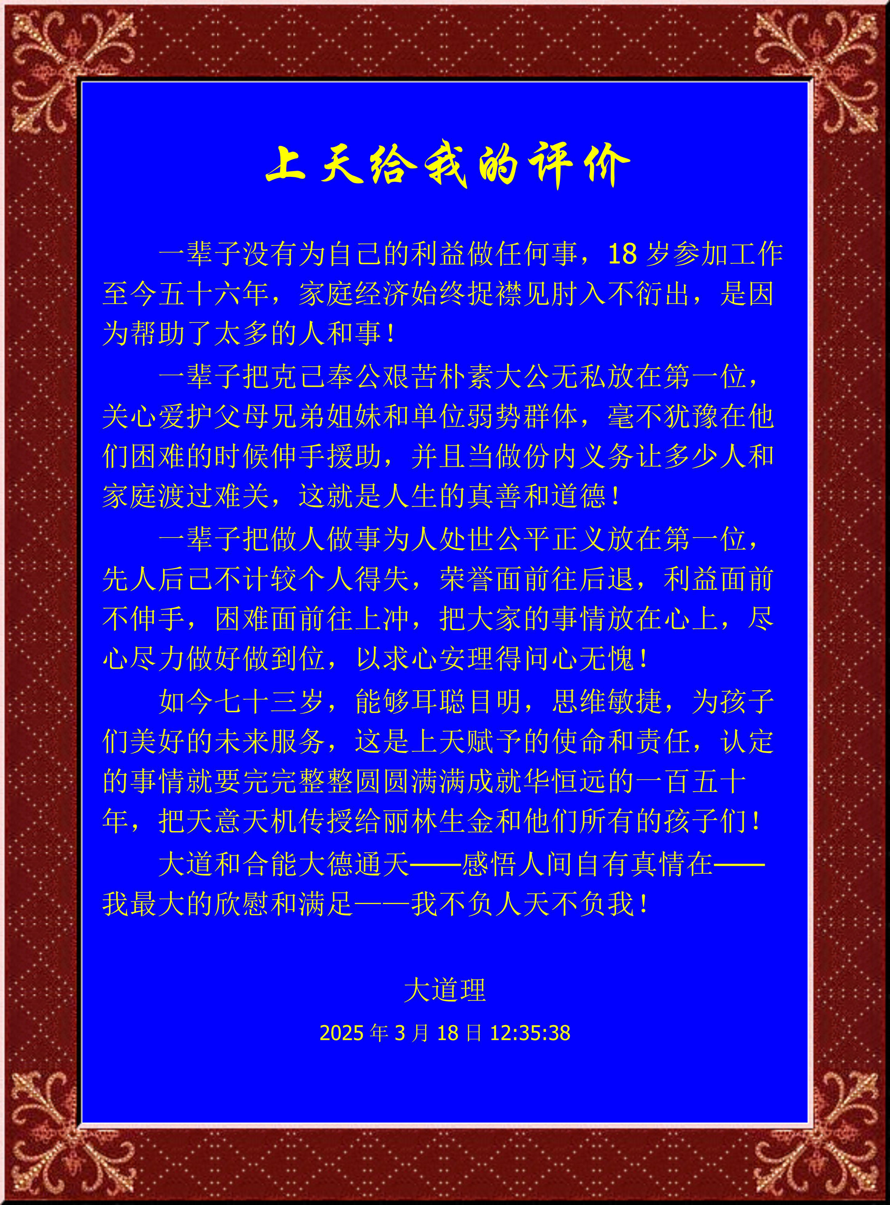 大道和合能大德通天——感悟人间自有真情在——我最大的欣慰和满足——我不负人天不负我!