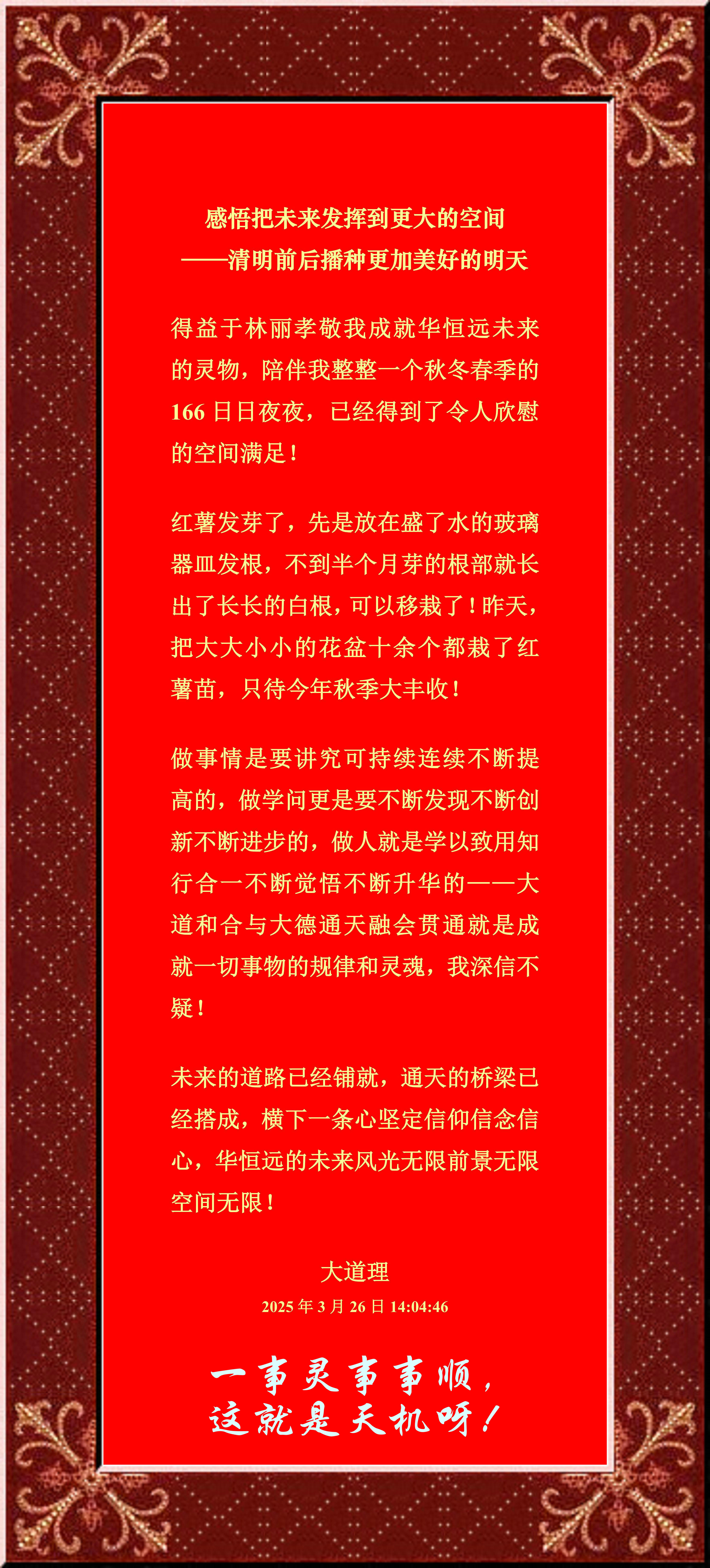 做事情是要讲究可持续连续不断提高的,做学问更是要不断发现不断创新不断进步的,做人就是学以致用知行合一不断觉悟不断升华的——大道和合与大德通天融会贯通就是成就一切事物的规律和灵魂,我深信不疑!