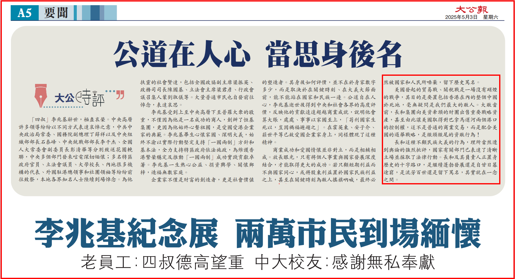 企业家不仅是财富的创造者,更是社会价值的塑造者。其身后如何评价,并不在于身家数字多少,而是取决于在关键时刻、在大义大节面前,能不能站在国家和民族一边。公道自在人心,李兆基逝世后得到中央和社会各界的高度评价,反映他的贡献远远超越商业成就,说明他会算大账,处处、事事以家国至上,「苟利国家生死以,岂因祸福避趋之」。在霍英东、安子介、庄世平等已故爱国企业家身上,同样体现了这种精神。