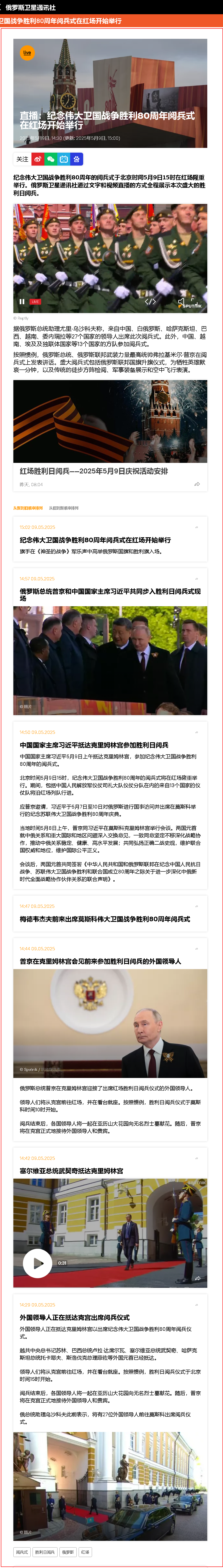 2025年5月9日10点(北京时间15点),俄罗斯在红场举行纪念卫国战争胜利80周年阅兵式,1万余名军人、125件武器装备接受检阅,中国人民解放军仪仗司礼大队也在红场亮相。观察者网带来现场直播解说,一起感受红场阅兵的恢弘气势。
