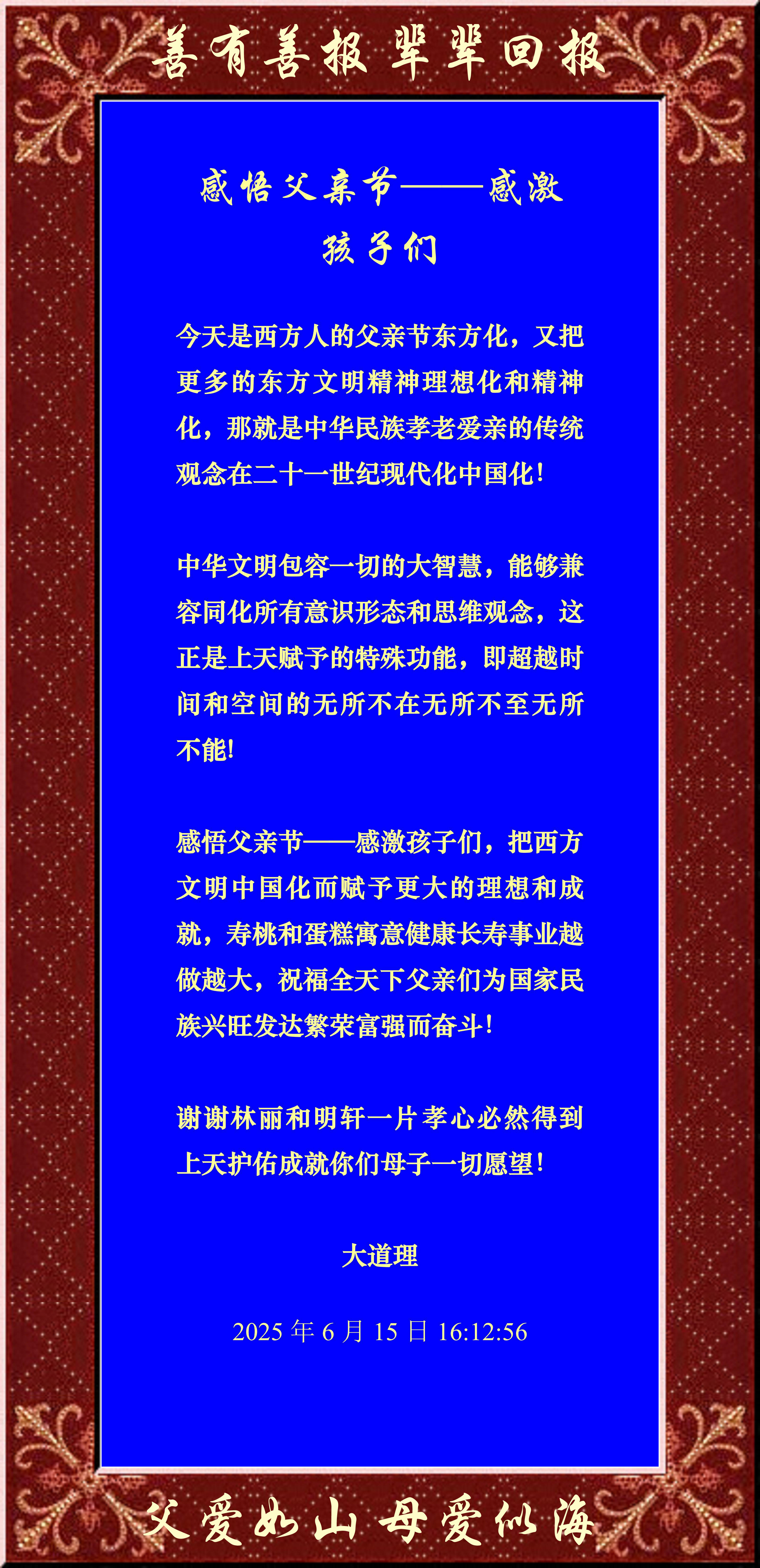 今天是西方人的父亲节东方化,又把更多的东方文明精神理想化和精神化,那就是中华民族孝老爱亲的传统观念在二十一世纪现代化中国化!