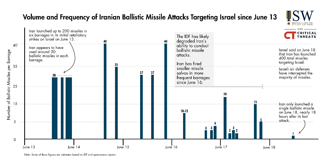 自6月13日以来,伊朗针对以色列的弹道导弹攻击数量和频率战争研究所