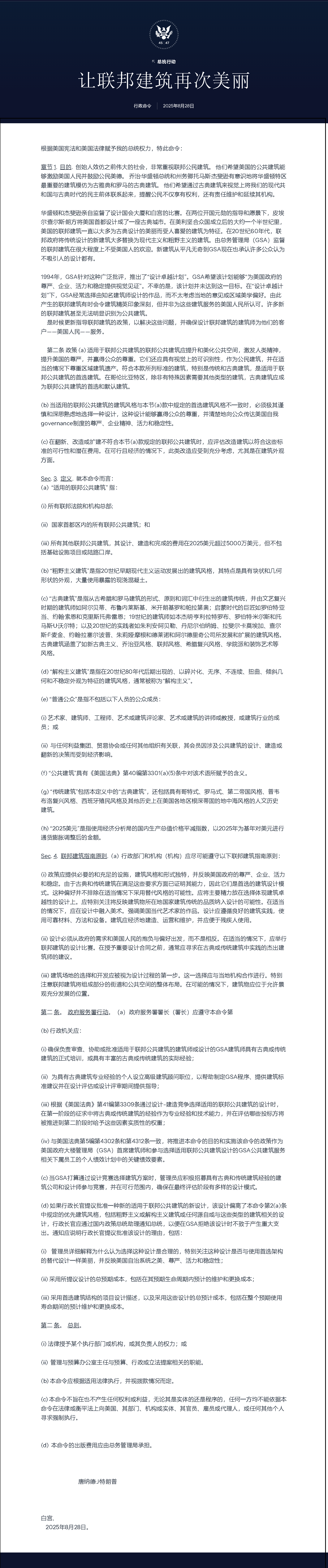 第二条 政策 (a) 适用于联邦公共建筑的联邦公共建筑应提升和美化公共空间,激发人类精神,提升美国的尊严,并赢得公众的尊重。它们还应具有视觉上的可识别性,作为公民建筑,并在适当的情况下尊重区域建筑遗产。符合本款所列标准的建筑,特别是传统和古典建筑,是适用于联邦公共建筑的首选建筑。在哥伦比亚特区,除非有特殊因素需要其他类型的建筑,古典建筑应成为联邦公共建筑的首选和默认建筑。