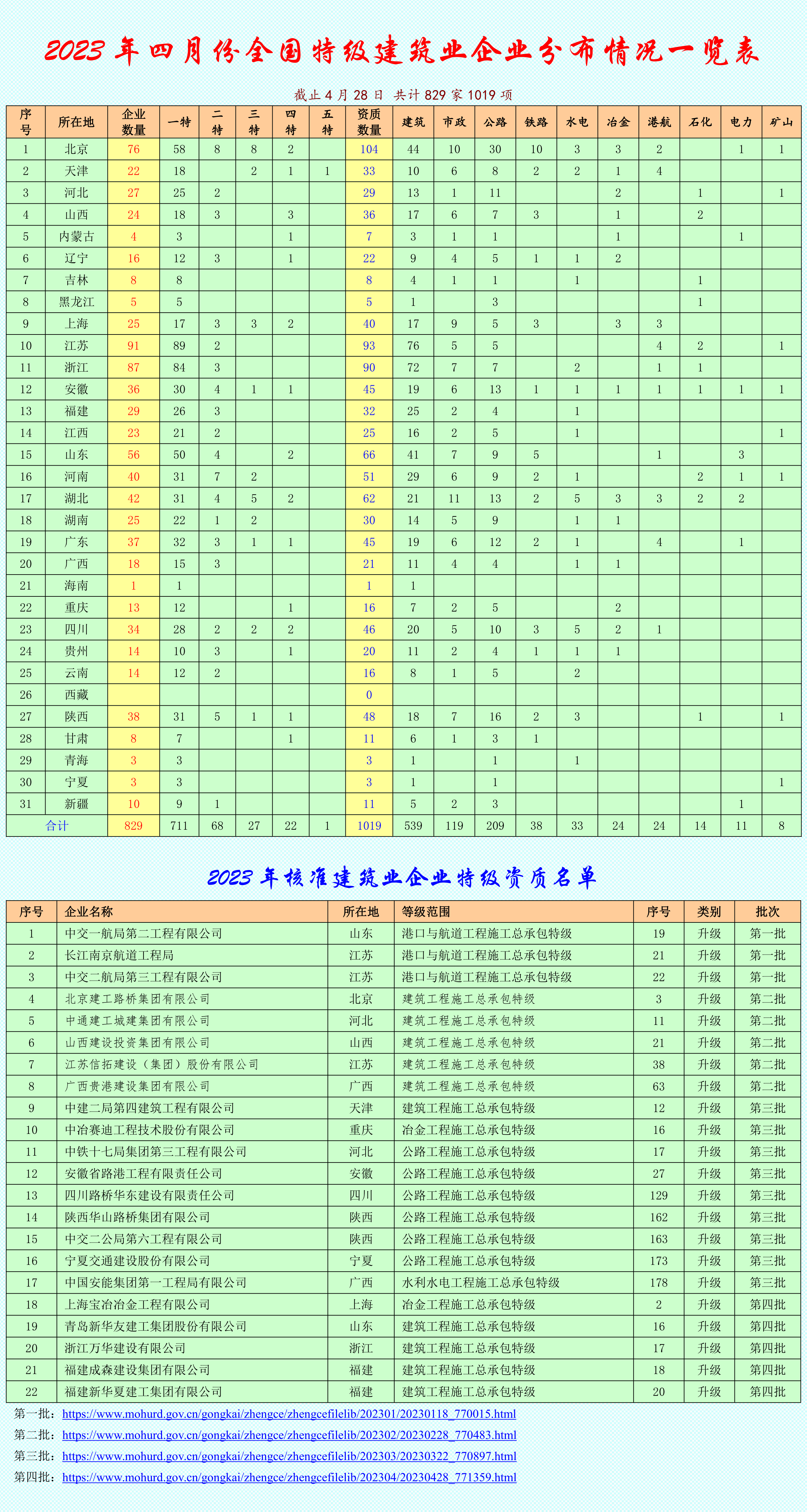 2023年四月份全国特级资质建筑业企业名单829家1019项