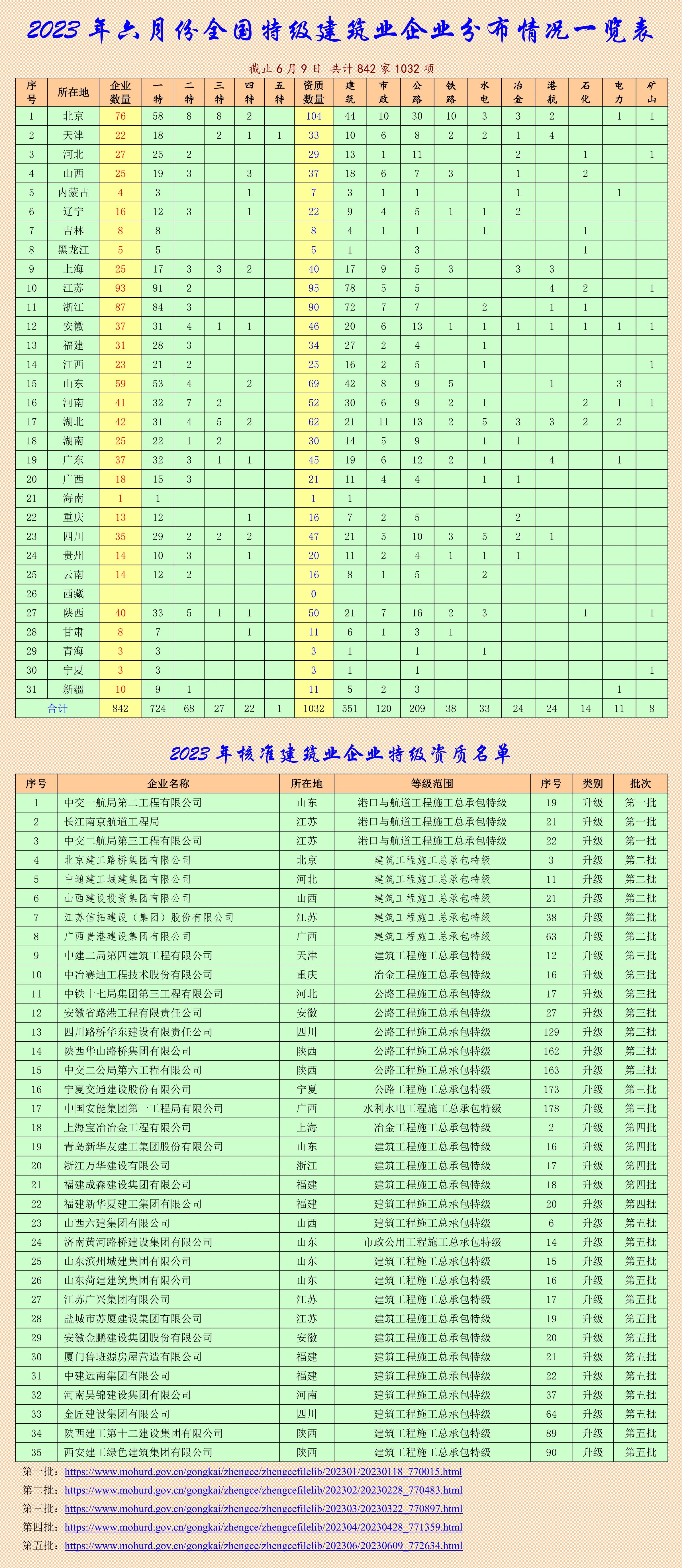 目前,我国特级建筑业企业已达842家,拥有资质1032项。江苏、浙江、北京三省(市)分别以93、87和76家特级企业名列前三,可谓是名副其实的建筑业大省;山东,湖北,河南,陕西四地特级企业均在40家以上,超过了全国特级企业总数一半,你追我赶竞争趋势越来越强。