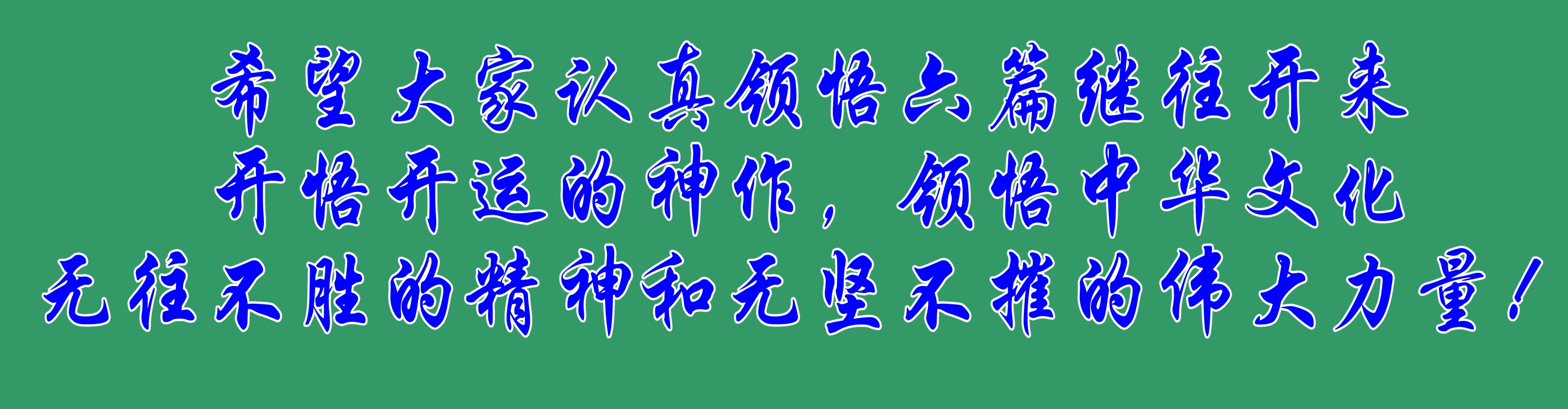 希望大家认真领悟六篇继往开来开悟开运的神作,领悟中华文化无往不胜的精神和无坚不摧的伟大力量!