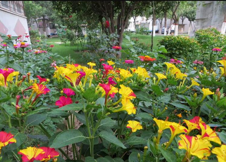它的学名叫紫茉莉,过去太原地区老人们叫它送闺女花,后来人们也叫它地雷花,可能是缘于它的种子黑黝黝像个小地雷吧!