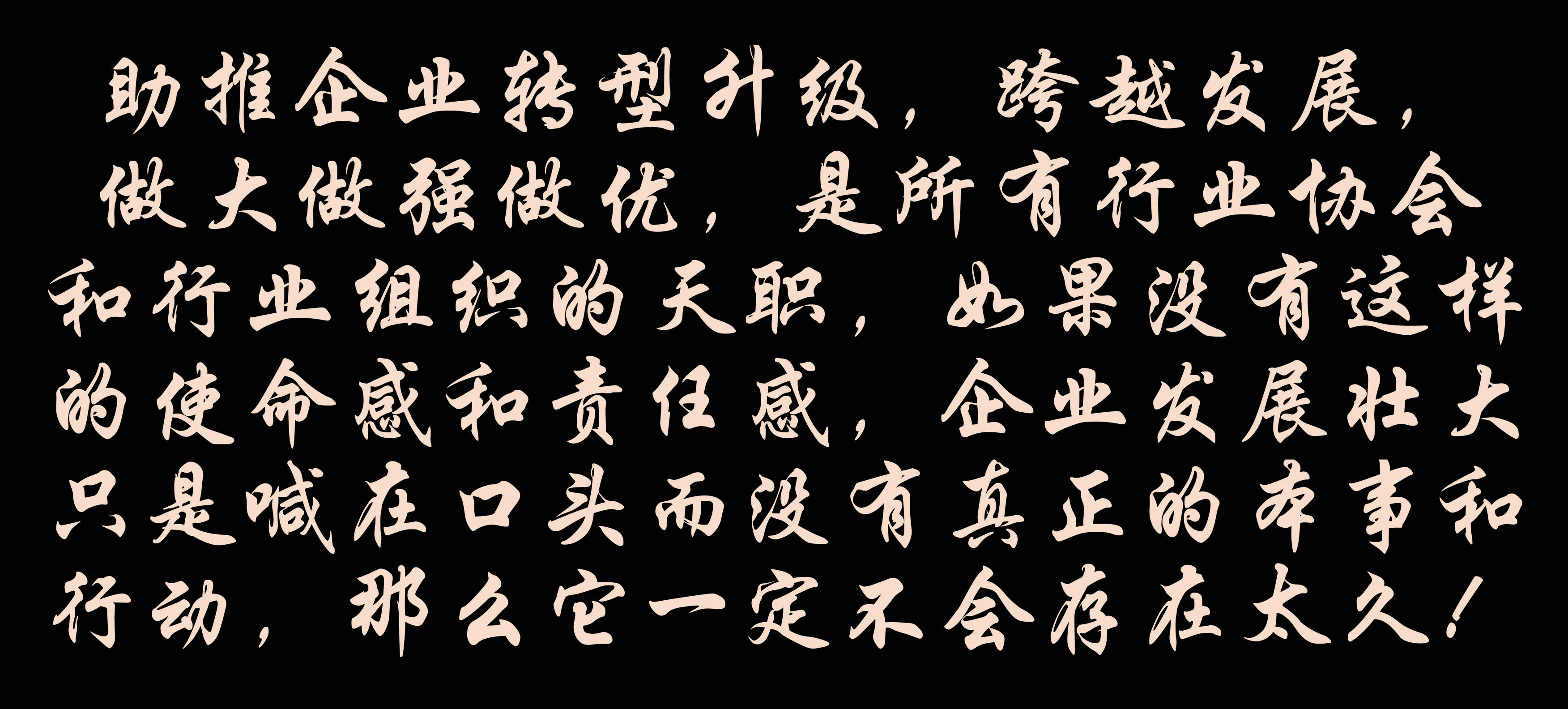 助推企业转型升级,跨越发展,做大做强做优,是所有行业协会和行业组织的天职,如果没有这样的使命感和责任感,企业发展壮大只是喊在口头而没有真正的本事和行动,那么它一定不会存在太久!
