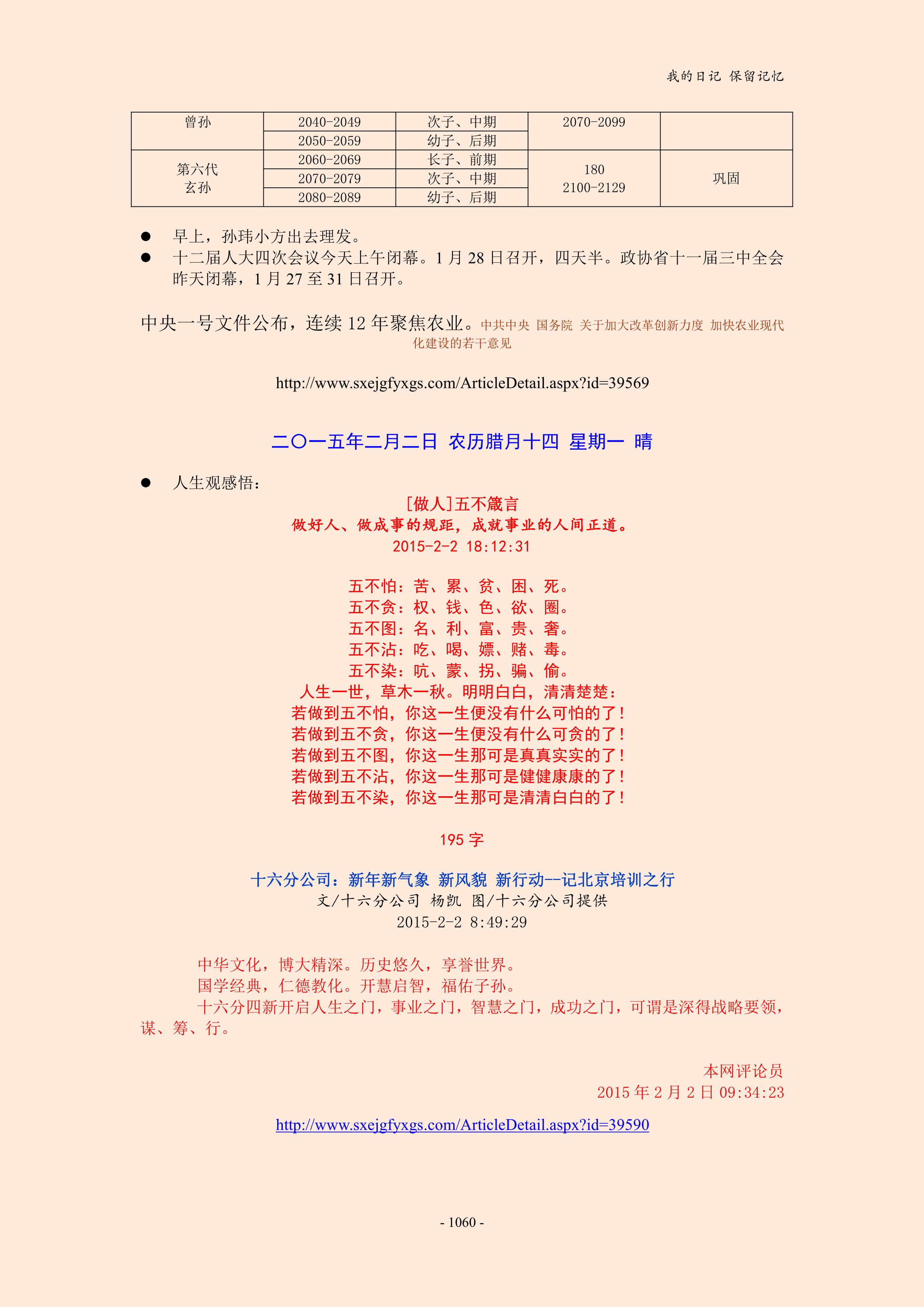 下面四页《我的日记·保留记忆》,记录了2015年1月31日至2月4日五天活动的内容。如果没有日记,那就是记忆的空白了!