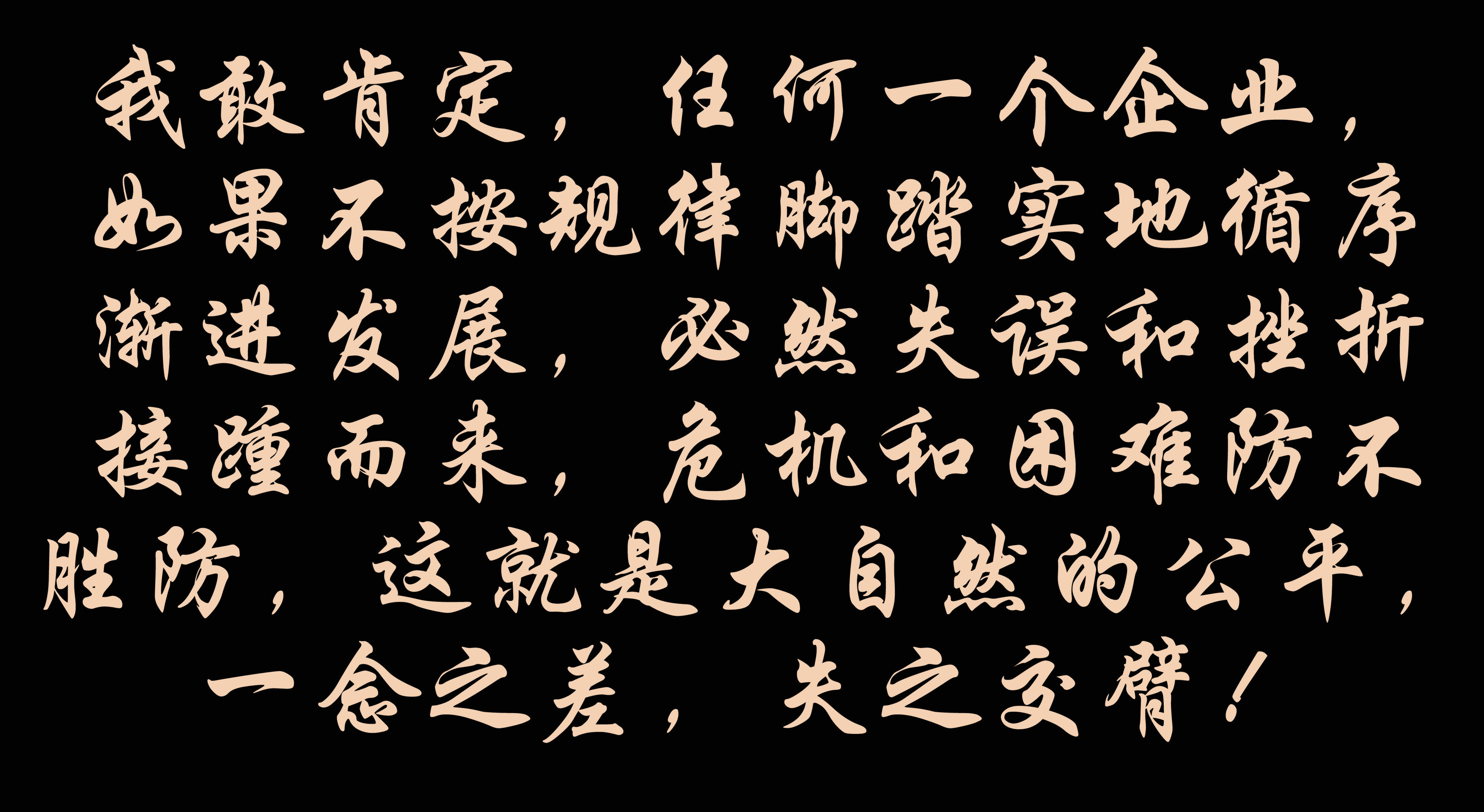 我敢肯定,任何一个企业,如果不按规律脚踏实地循序渐进发展,必然失误和挫折接踵而来,危机和困难防不胜防,这就是大自然的公平,一念之差,失之交臂!耽误了你的宝贵时间和机遇,可惜了!