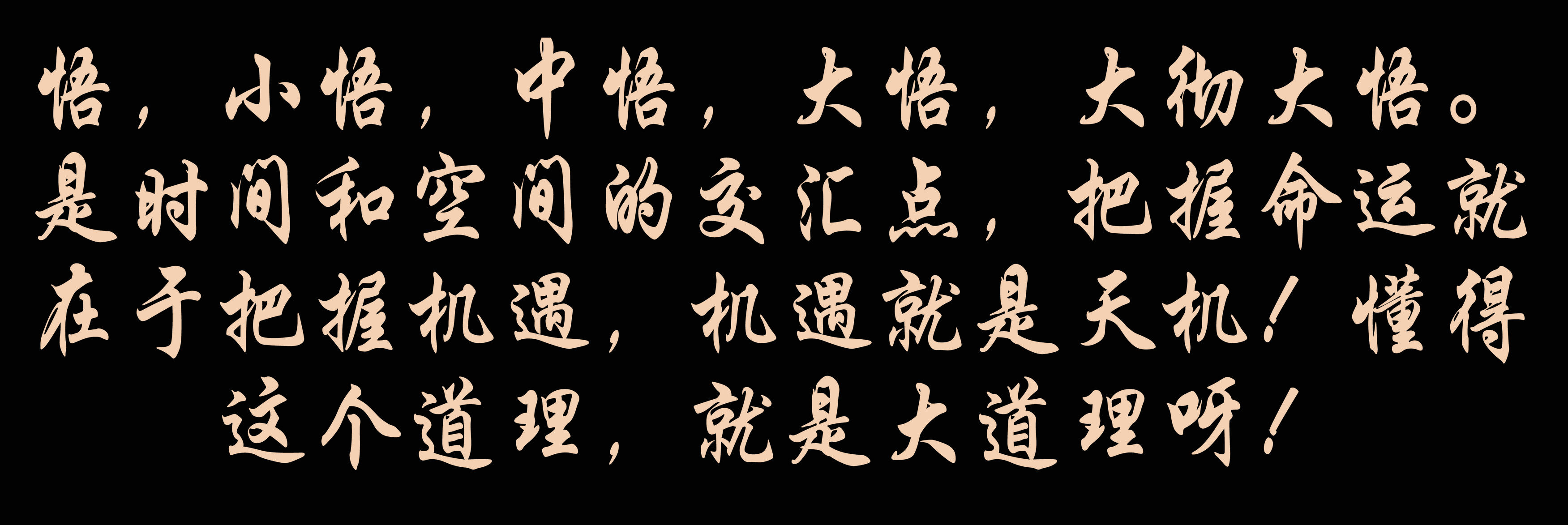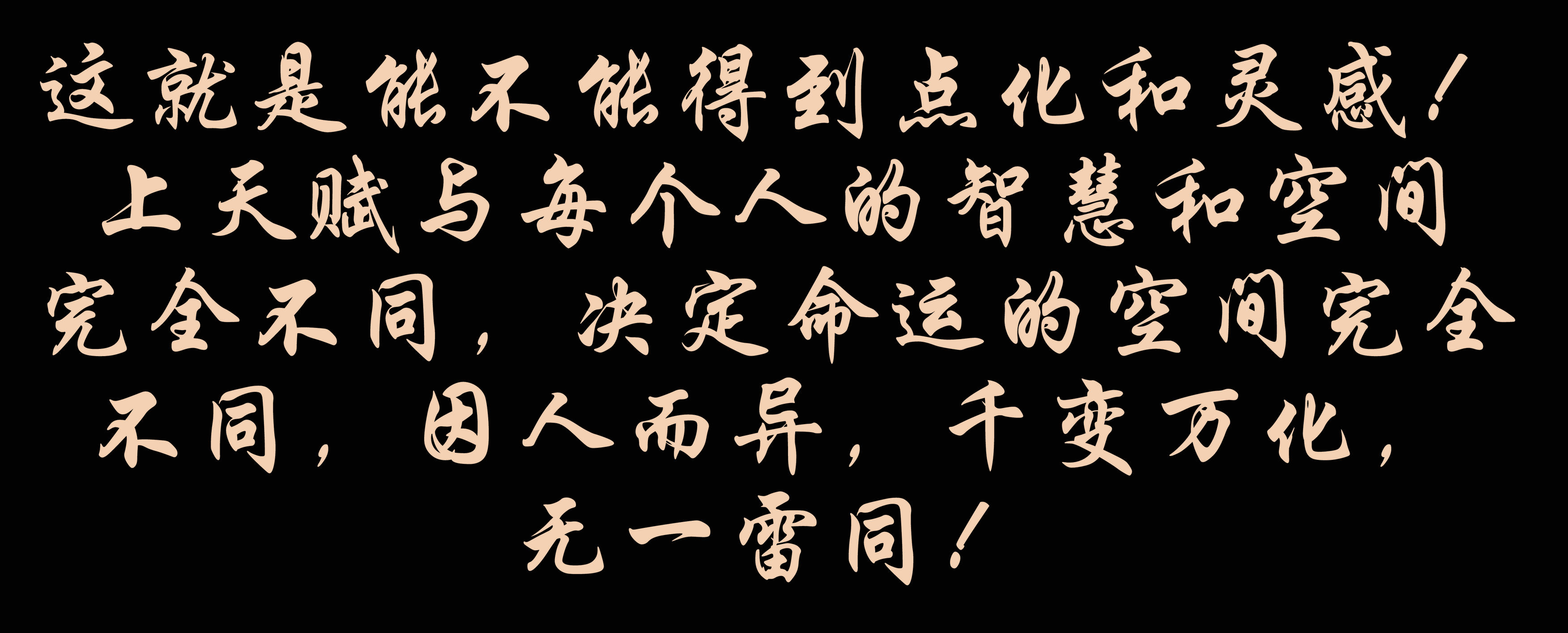 悟,小悟,中悟,大悟,大彻大悟。是时间和空间的交汇点,把握命运就在于把握机遇,机遇就是天机!懂得这个道理,就是大道理呀!先天的基因必须在后天十二岁,也就是在人生初期第一个十二年中激活,方可明白人是什么,来人世间做什么,需要怎么去做,怎么才能够做好!这就是能不能得到点化和灵感!上天赋与每个人的智慧和空间完全不同,决定命运的空间完全不同,因人而异,千变万化,无一雷同!