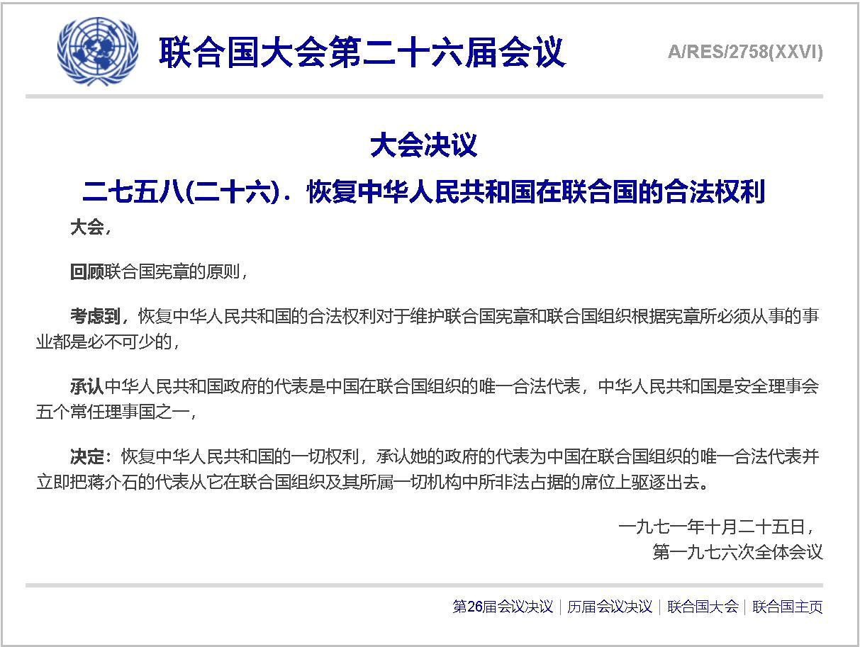 1971年召开的第二十六届联合国大会,是伸张正义的一届大会。自10月18日起,大会就中国席位问题展开激烈的辩论。10月25日,大会就三个有关中国席位的提案进行表决。