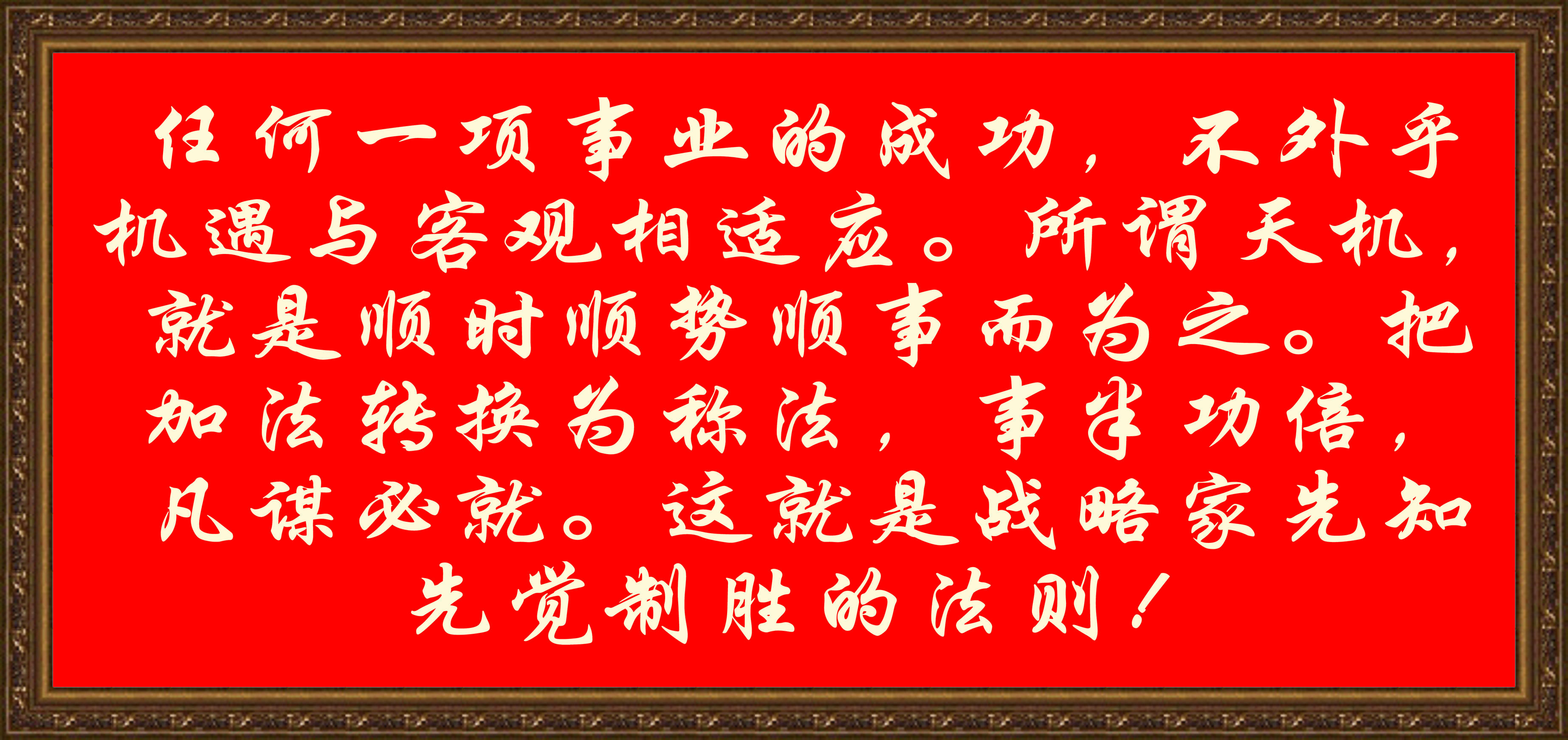 任何一项事业的成功,不外乎机遇与客观相适应。所谓天机,就是顺时顺势顺事而为之。把加法转换为称法,事半功倍,凡谋必就。这就是战略家先知先觉制胜的法则!