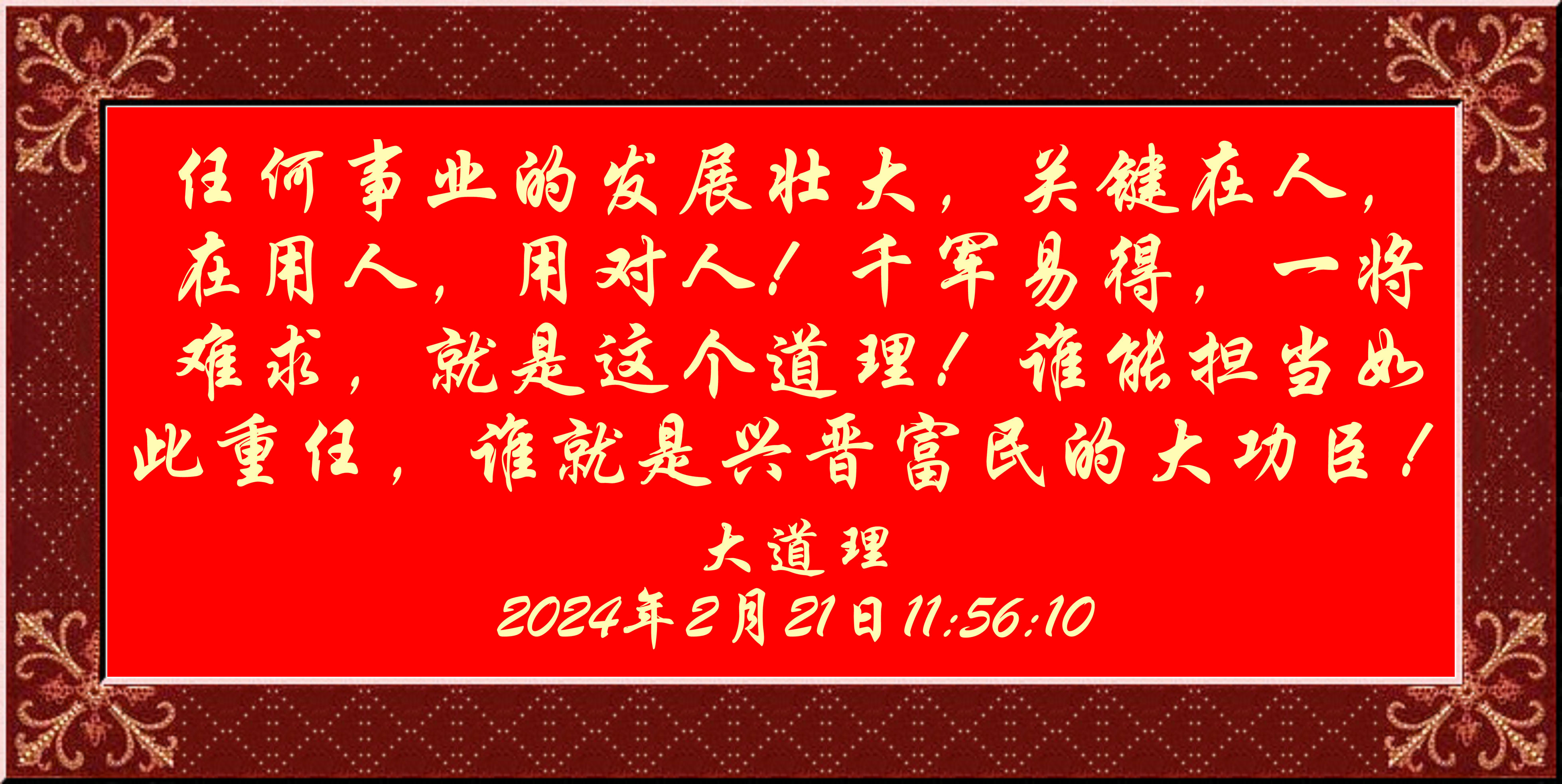 任何事业的发展壮大,关键在人,在用人,用对人!千军易得,一将难求,就是这个道理!谁能担当如此重任,谁就是兴晋富民的大功臣!